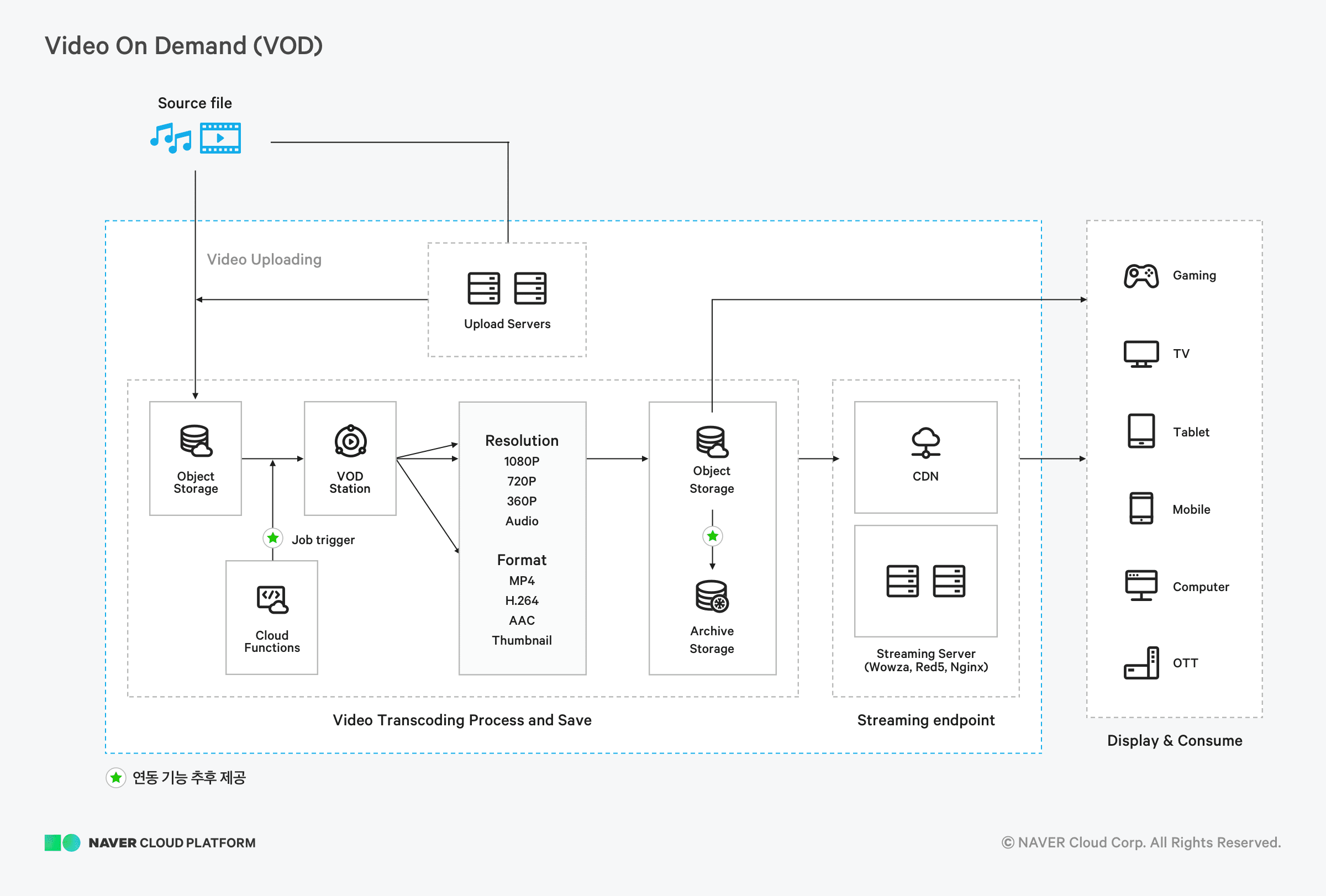 VOD서비스는 인터넷을 통해 원하는 시간에 원하는 영상을 볼 수 있도록 하는 주문형 비디오 서비스입니다. 고품질의 VOD 멀티미디어 서비스를 위해서는 대용량의 파일 관리 기능, 비디오/오디오 파일 트랜스 코딩, 실시간 VOD 배포 및 네트워크 효율성이 보장이 되어야 합니다. 네이버 클라우드 플랫폼에서는 VOD서비스를 위해 파일 업로드와 변환, 배포 각 단계에 필요한 기능과 성능을 가진 상품을 제공하고 있습니다. 높은 가용성과 확장성을 가진 오브젝트 스토리지에 무한대로 소스 파일을 저장할 수 있고 고사양의 컴퓨팅 자원에서의 트랜스코딩 작업은 사용한 만큼만 비용이 발생하므로 합리적입니다. 변환된 파일 결과물은 Object Storage에 저장이 되어 직접 사용자에게 전달 되도록 할 수도 있지만 CDN의 컨텐츠 가속 기능을 이용하여 네트워크 지연 없이 세계 각지의 사용자에게 전달할 수 있습니다.