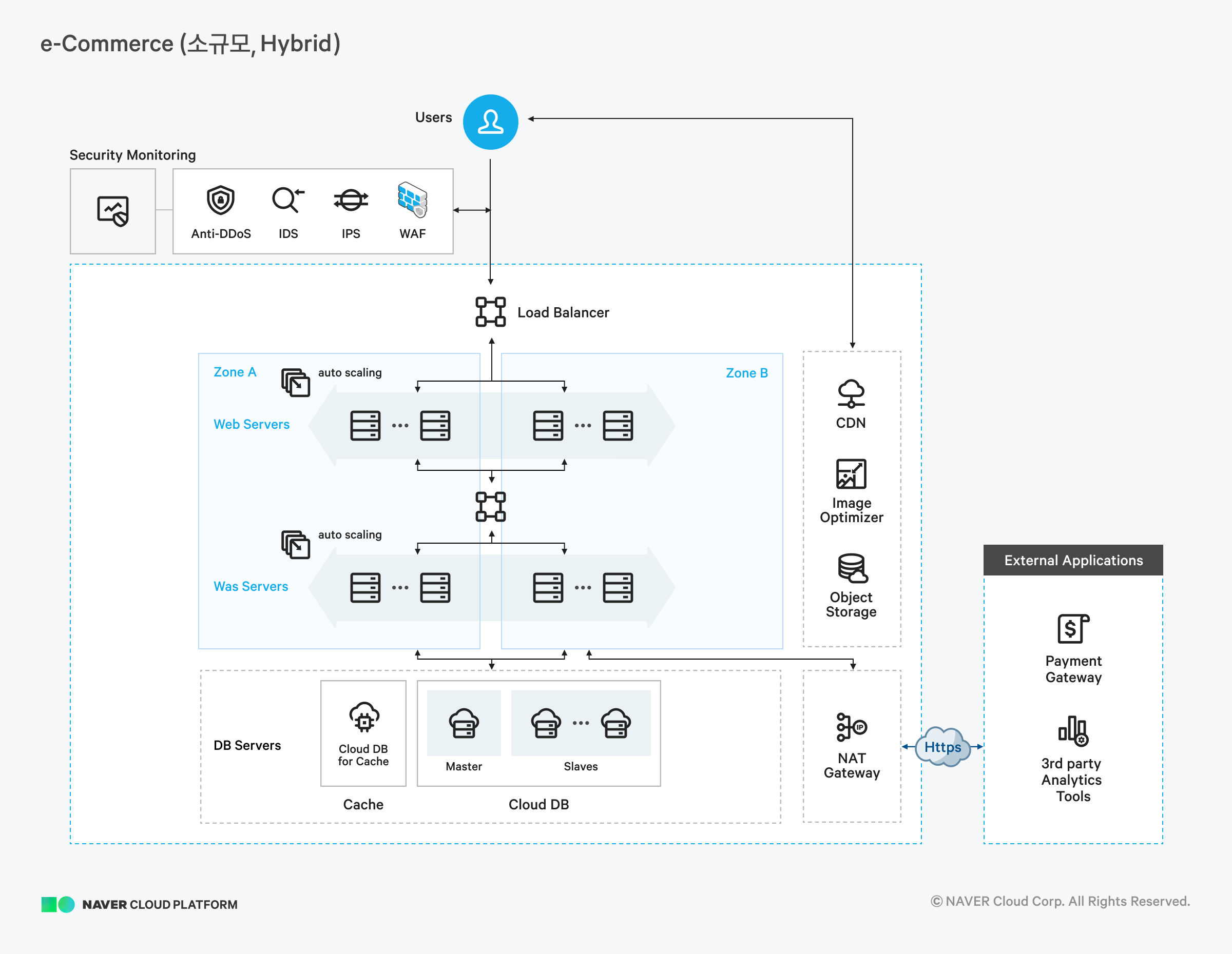 전자상거래 시장에서의 경쟁력을 높이기 위해서는 보안 위협으로부터 안전해야 하고, 예측 불가능한 수요에 대비해야 합니다. 신규 상품이 출시되는 시기에는 불과 20~30분 내에 평상시보다 몇 배의 높은 트래픽이 발생해 시스템이 마비되는 경우도 있기 때문에 신속한 서버 증설과 대규모 트래픽에 대비한 분산 아키텍처를 구성해야 합니다. 이를 위해 클라우드의 Auto Scaling과 멀티존을 활용하면 트래픽 분산과 유연한 인프라 관리가 가능합니다. 또한 다양한 디바이스와 항상 연결되어야 하며, 국내는 물론 글로벌로의 신속한 확장을 고려한다면 네이버 클라우드 플랫폼에서 네이버를 지키는 세계적 수준의 보안 기술력과 안정성을 기반으로 높은 품질의 클라우드 서비스를 제공받을 수 있습니다.