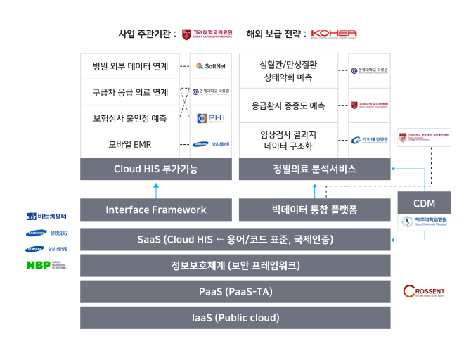 의료정보보호 분야 국제표준인 ISO-27799를 인증받은 네이버 클라우드 플랫폼을 기반으로 26개 병원, ICT/SW 기업 22개가 참여한 국내 최대규모 컨소시엄입니다.