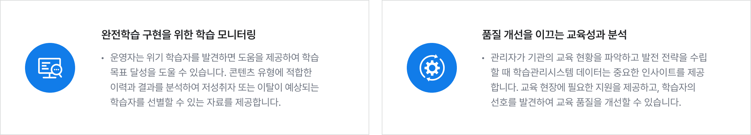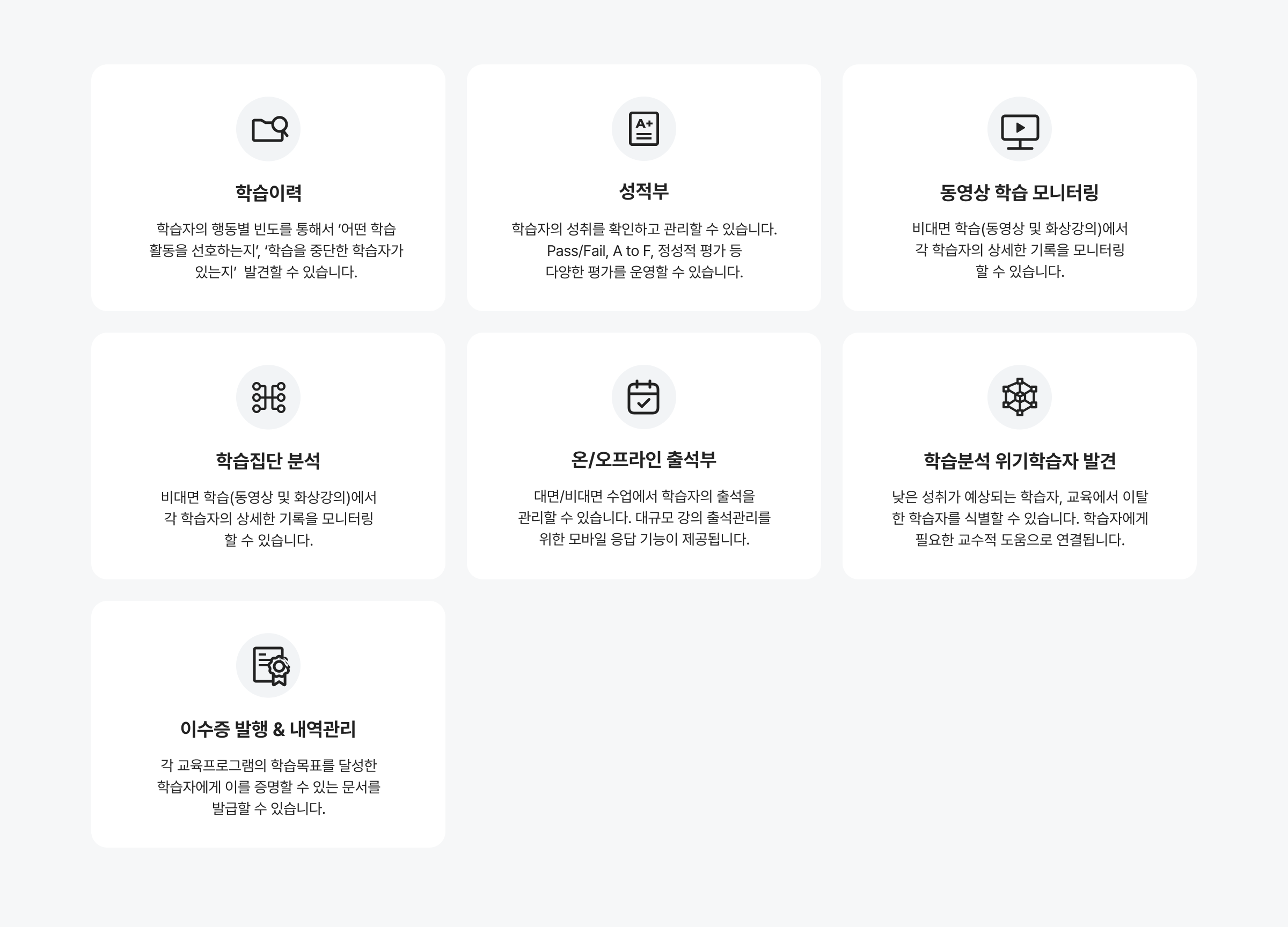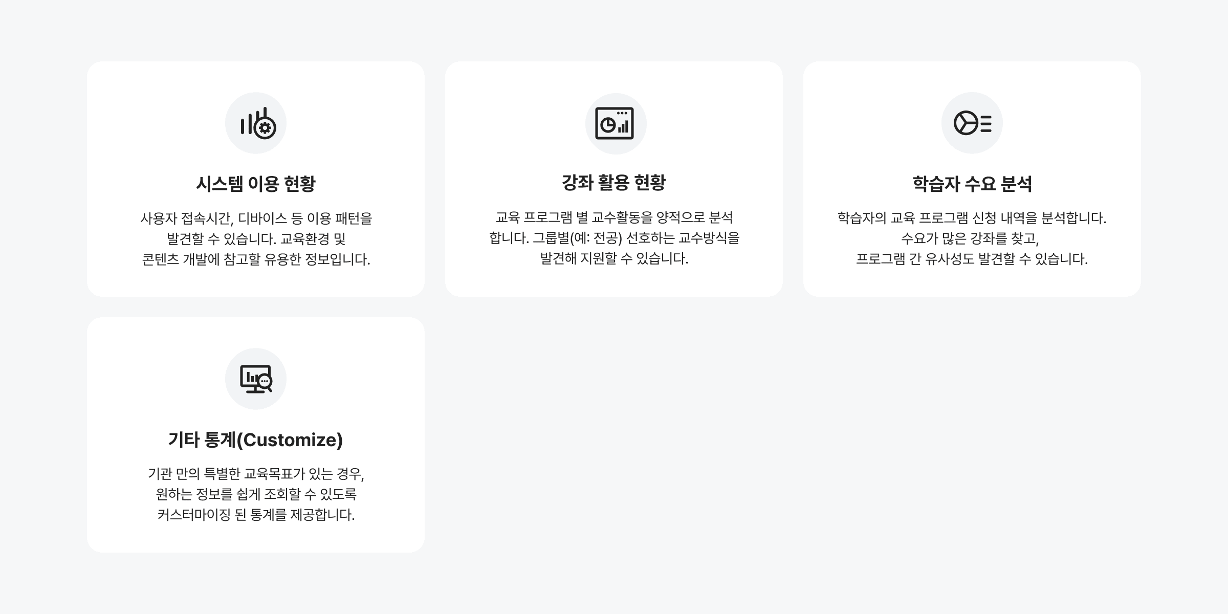 도입 기관의 교육 프로그램 운영 기록을 바탕으로 교육성과를 분석하고 통찰을 제공합니다.