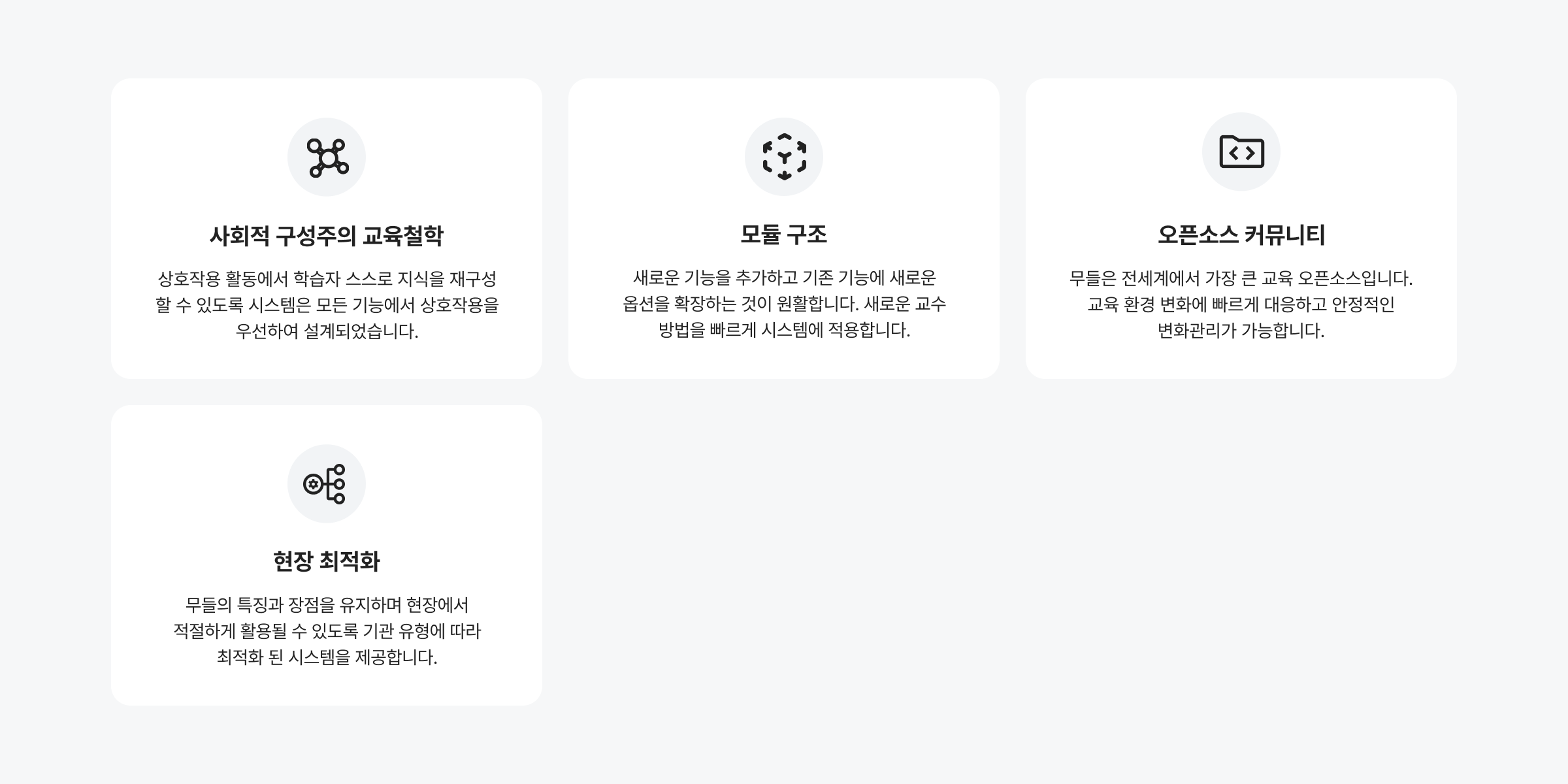 코스모스는 무들의 철학과 장점이 교육현장에서 구현될 수 있도록 합니다.