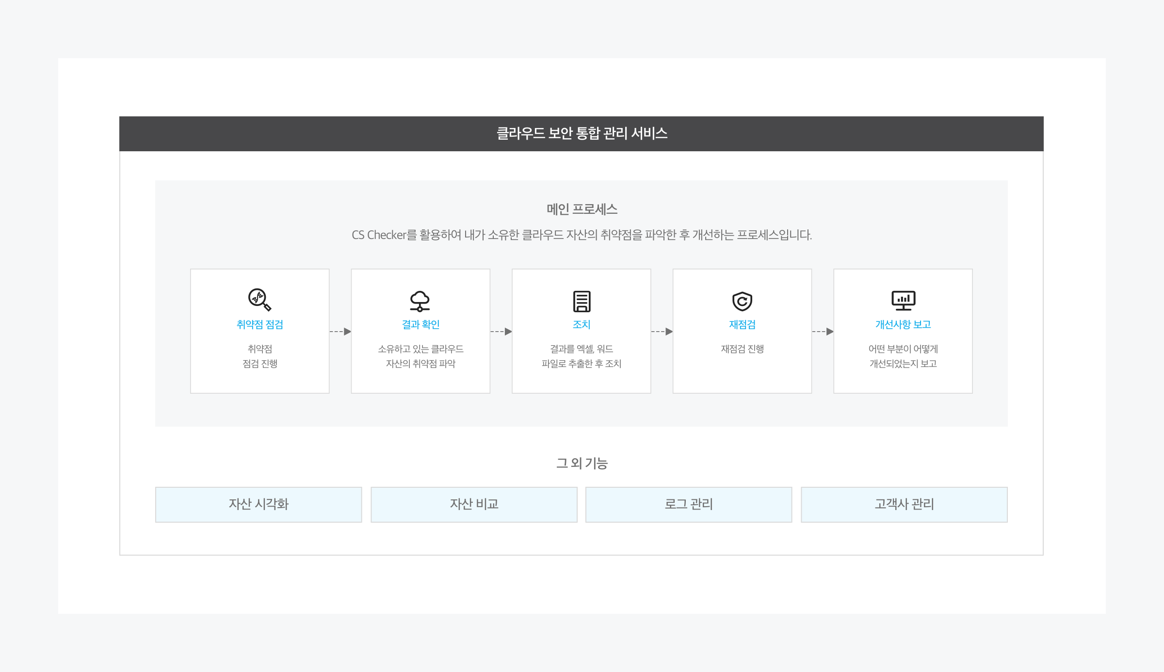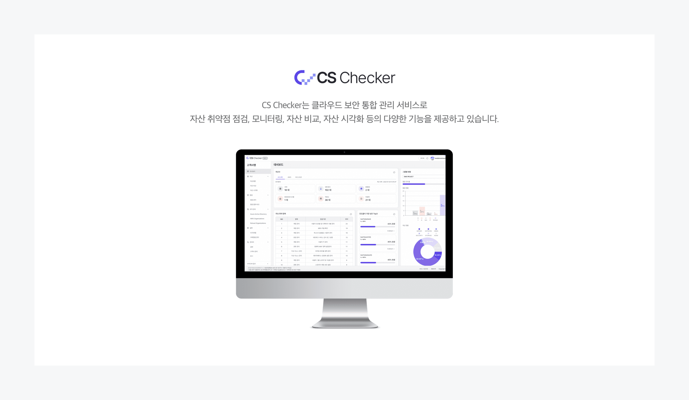 CS Checker는 클라우드 인프라 자산 대장, 자산 비교, 자산 시각화 기능을 제공하며 콘솔 점검 영역에서 취약점 진단 및 모니터링, 보고서 생성 등 다양한 기능을 제공하는 클라우드 보안 통합 관리 서비스입니다.