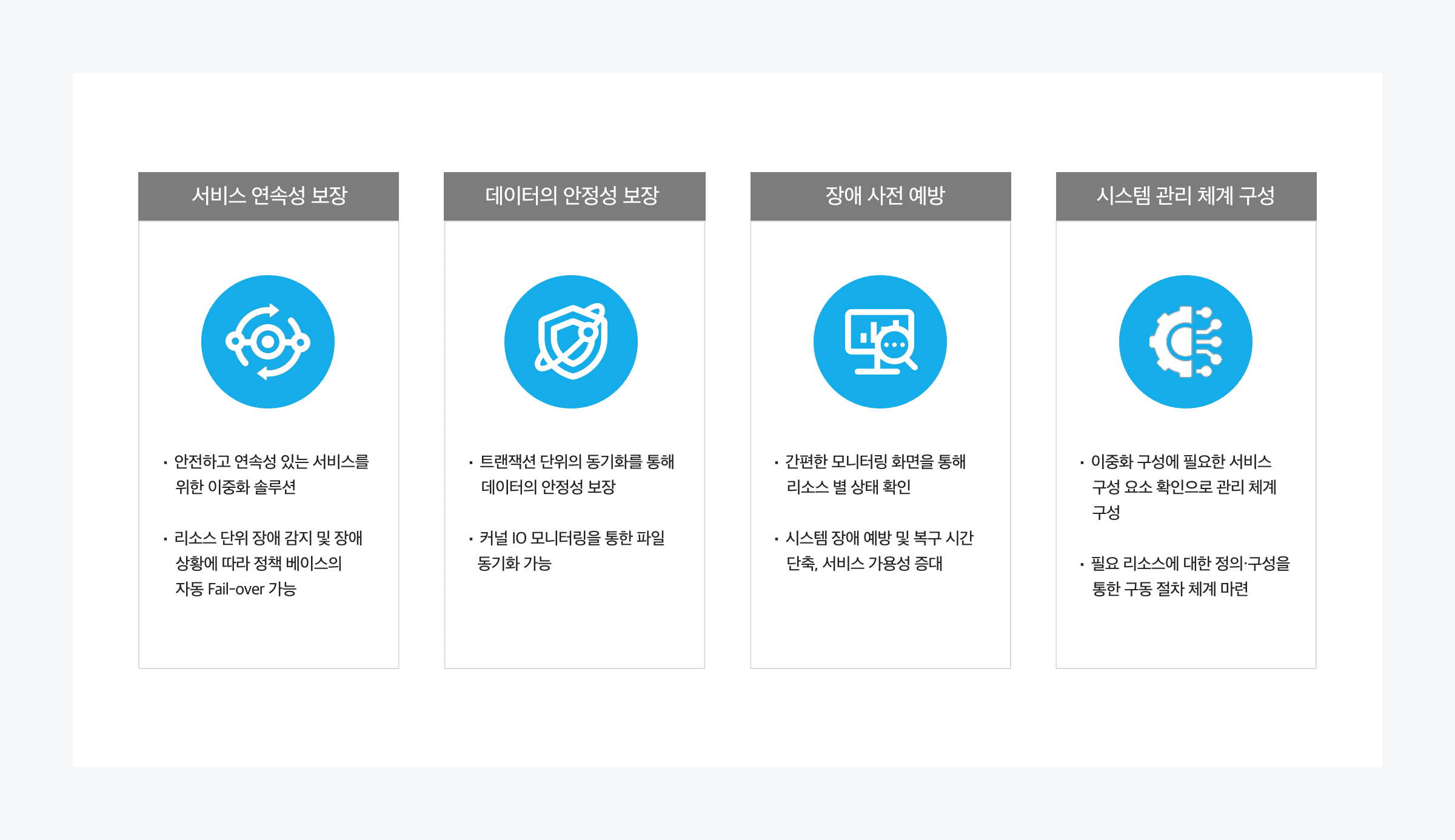 관리 및 운영이 편리하고 안정적으로 운용할 수 있는 ClusterPlex v5를 통해 서비스 연속성 향상, 데이터의 안정성 보장, 장애 사전 예방 및 시스템 관리 체계 구성이 가능합니다.
