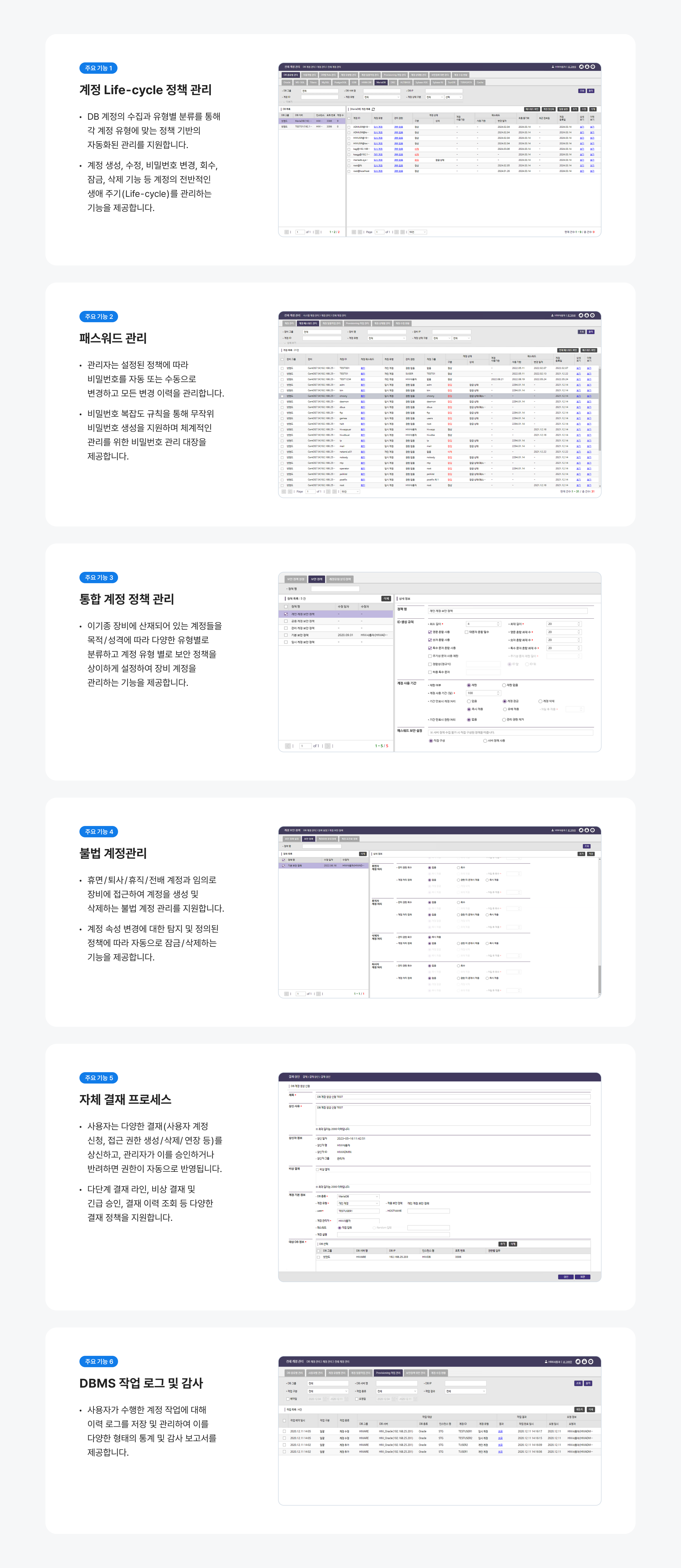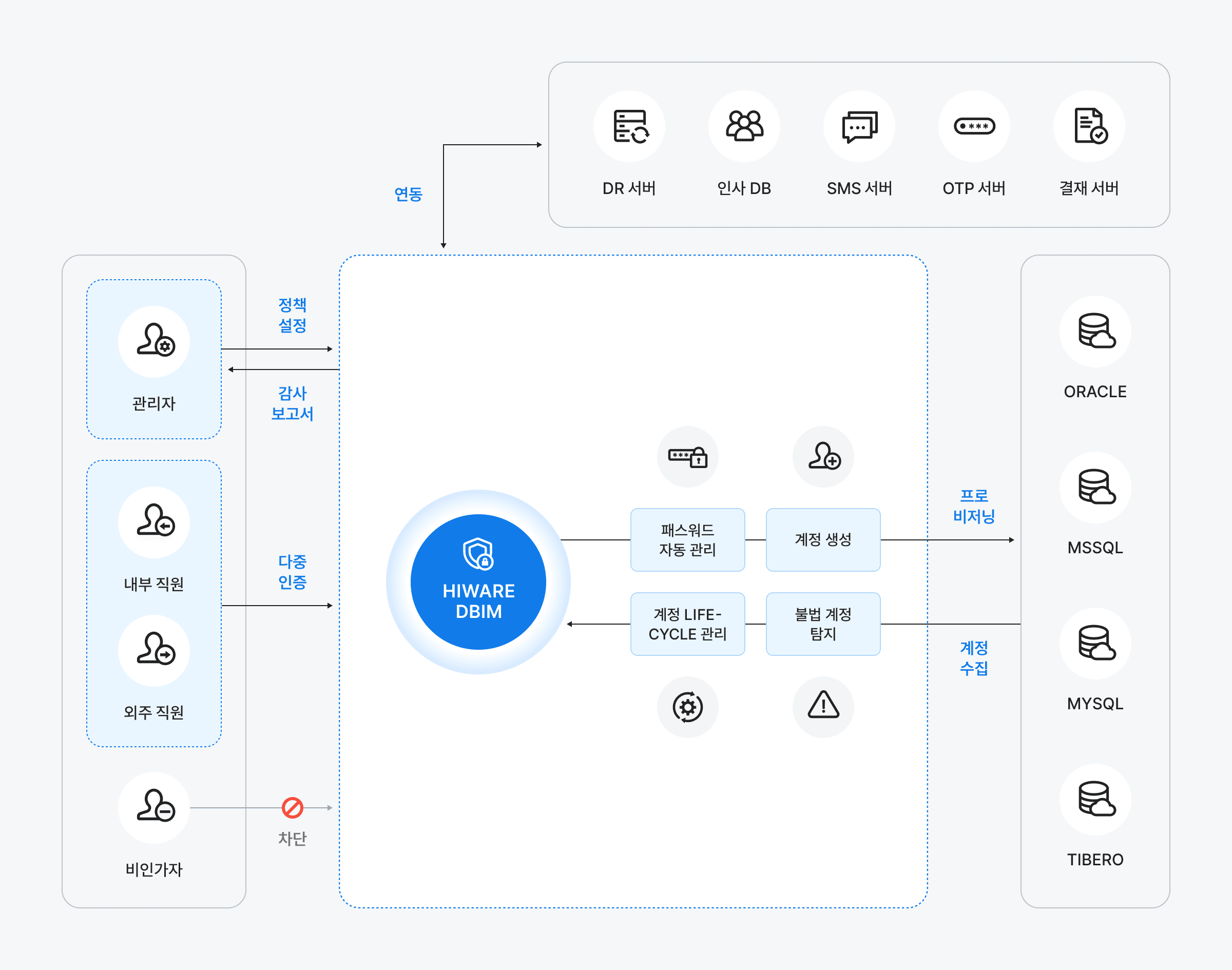 HIWARE DBIM(DB 계정관리)은 관리 대상 DBMS에 존재하는 수 많은 DB계정들을 수집하여 중앙에서 통합 관리합니다. 계정의 Life-Cycle과 패스워드를 보안정책에 따라 자동화 관리하여 업무 효율성을 증대합니다.