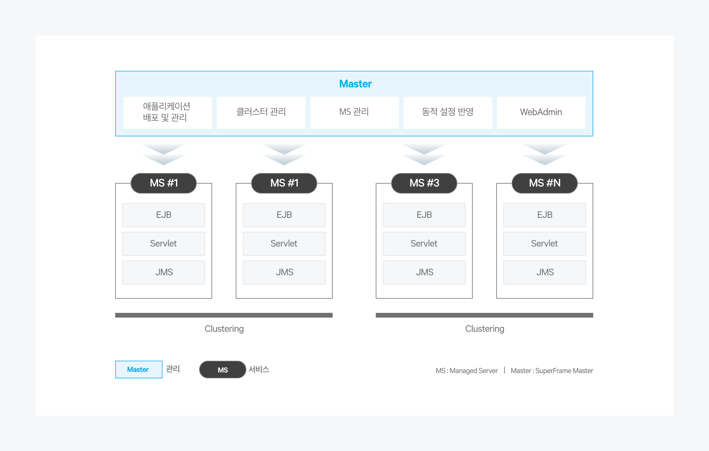 통합 모니터링 SuperFrame Master를 통해 온프레미스, 클라우드 환경에 최적화된 통합 인스턴스 관리를 지원합니다. WAS에 대한 통합 관리가 가능하여 서로 다른 업무를 하나의 화면으로 모니터링 할 수 있는 기능을 제공합니다.
