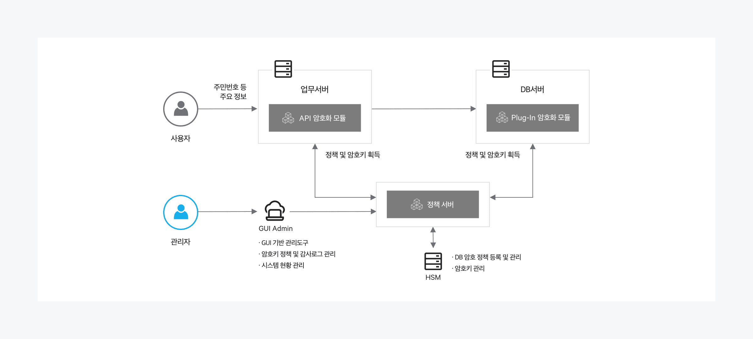 ㆍ키관리 서버 또는 소프트웨어 방식으로 암호용 키를 안전하게 관리합니다.