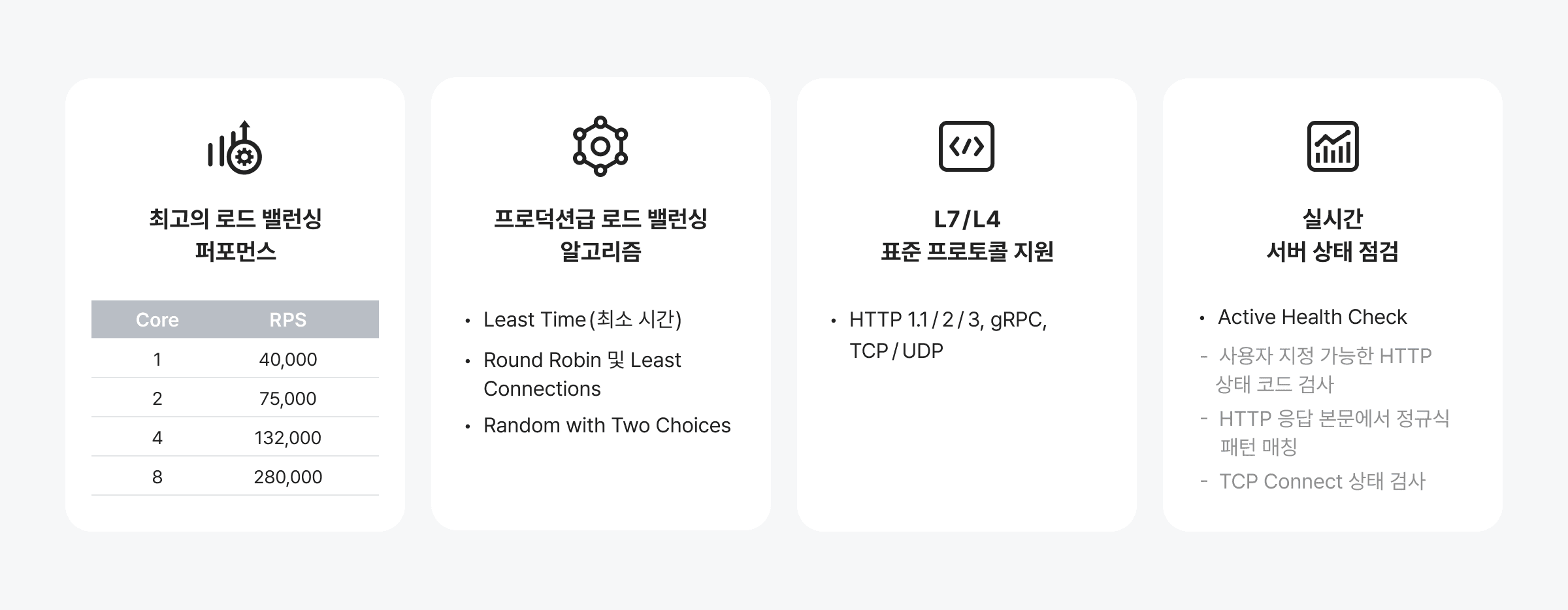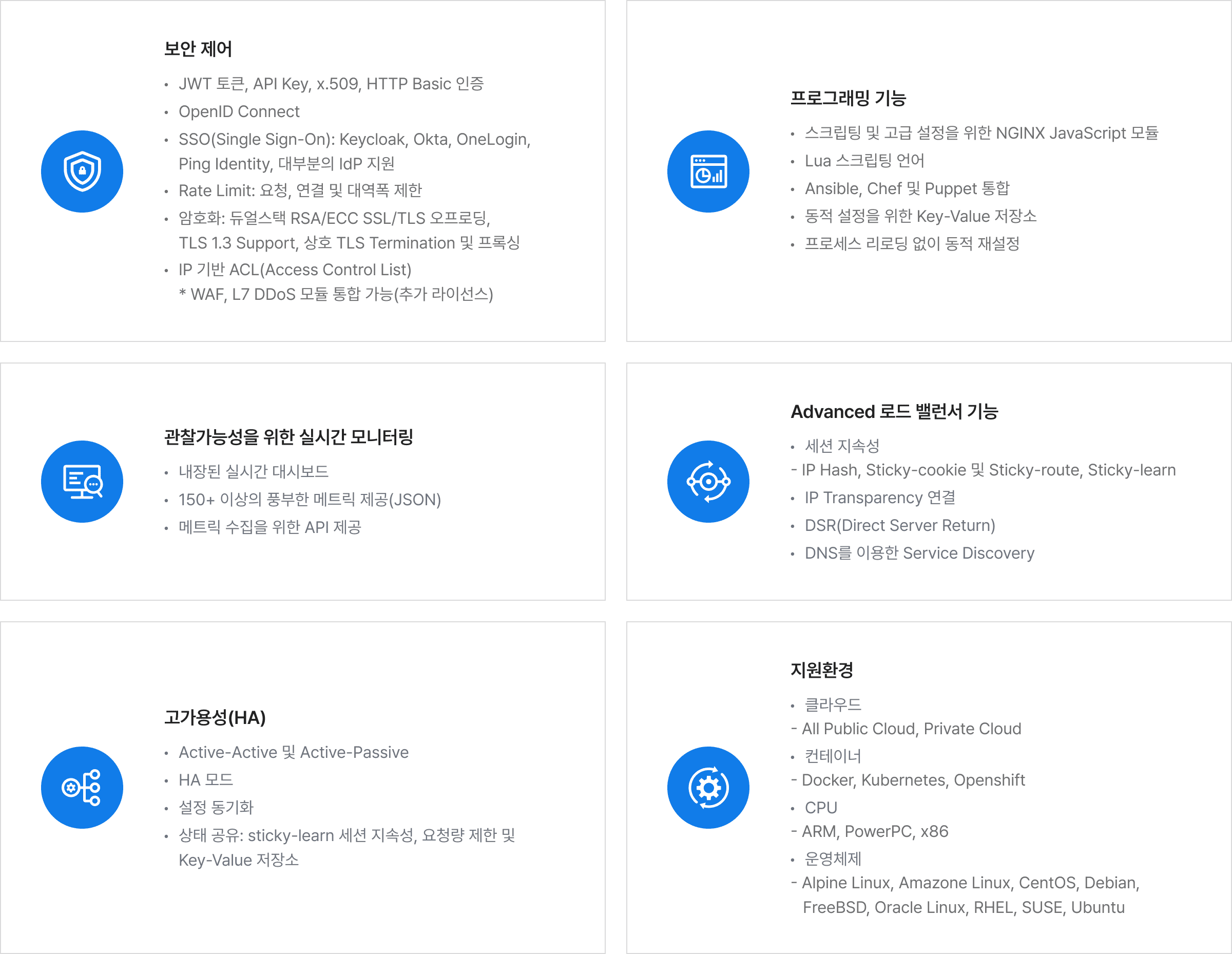 NGINX Plus Load Balancer는 Cloud-Native 환경에 최적화된 고성능 L4/L7 올인원 로드 밸런서로 고급 로드 밸런싱, 액티브 헬스 체크, 실시간 모니터링, RESTful API 등의 기능과 다양한 프로토콜 지원을 제공합니다.