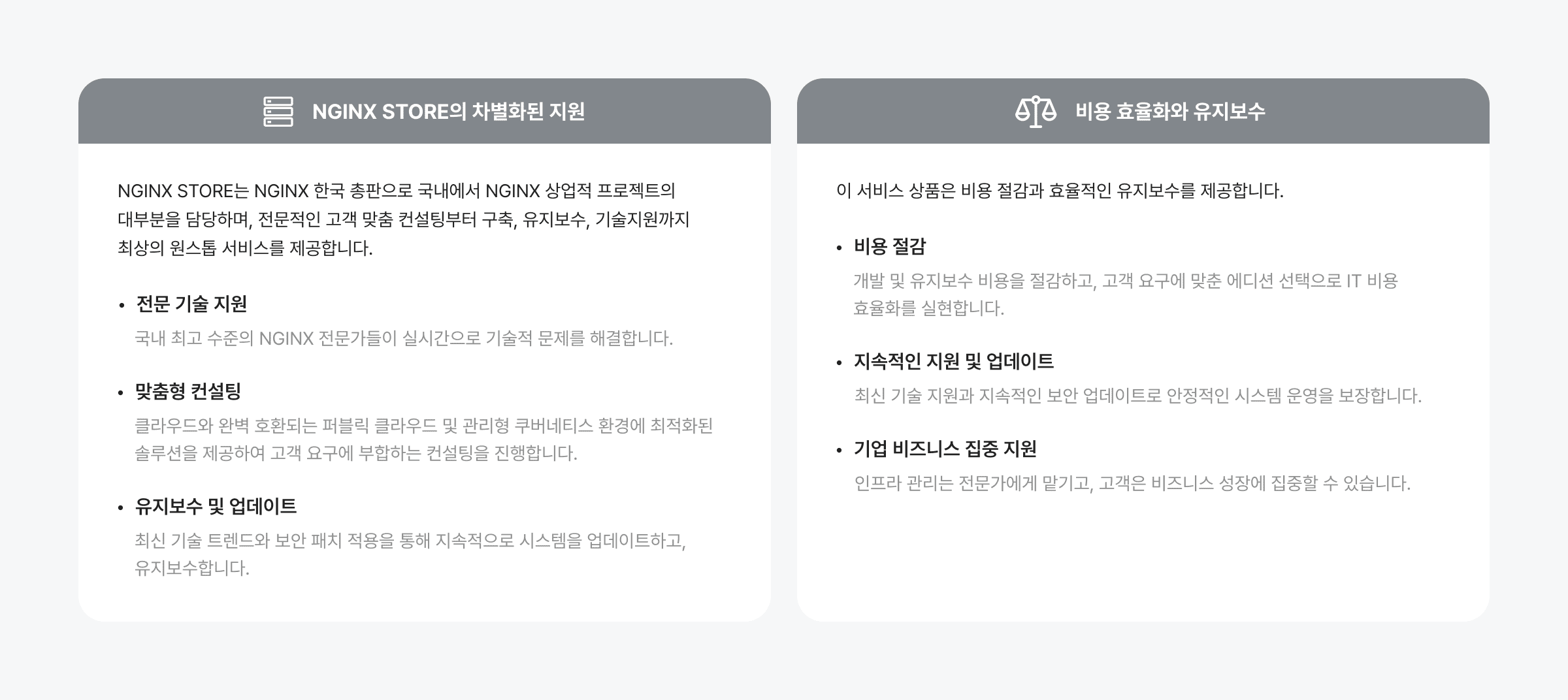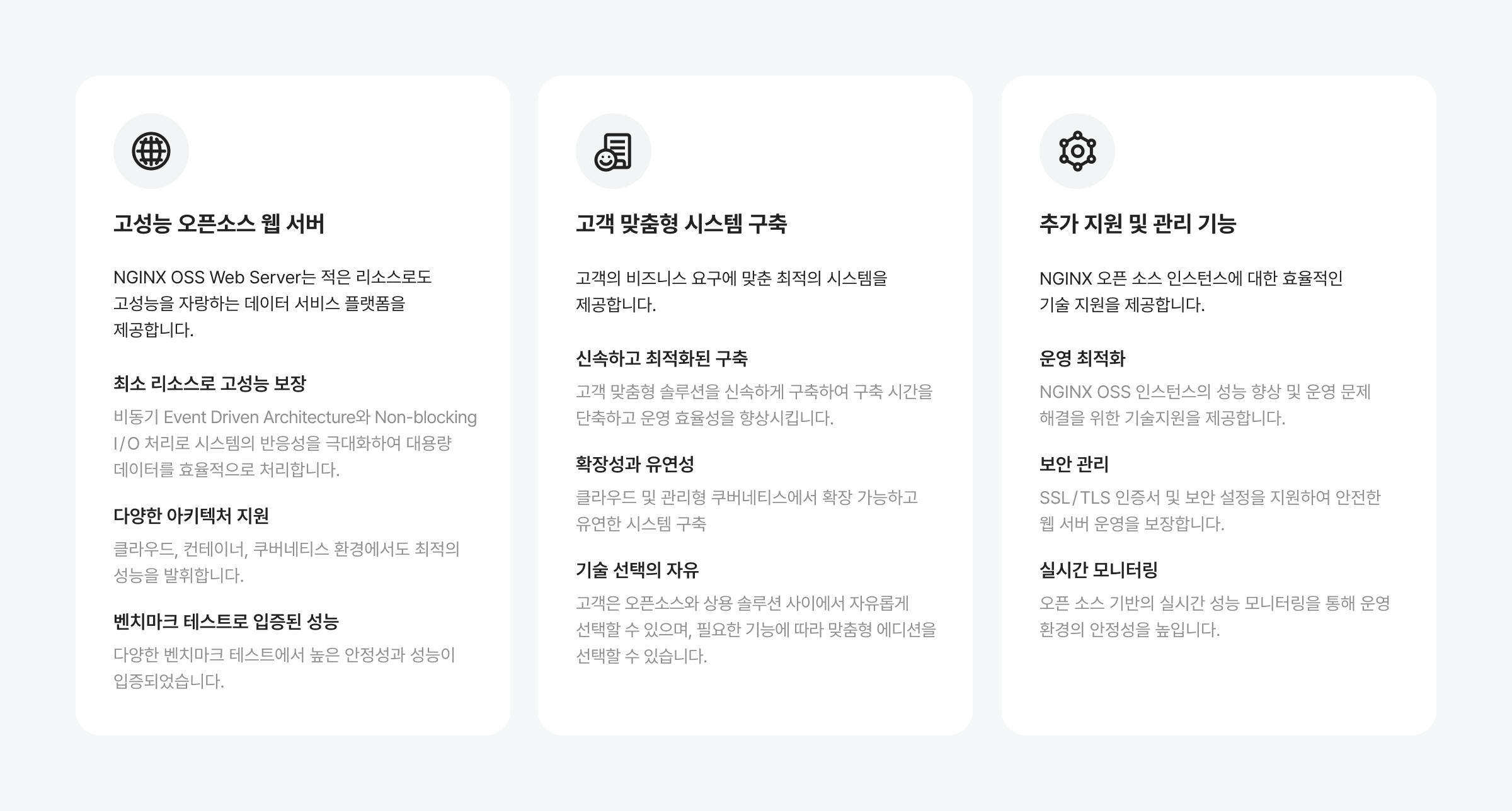 NGINX STORE_NGINX OSS Web Server는 클라우드 및 쿠버네티스 환경에 최적화된 고성능 오픈소스 웹 서버로, 맞춤형 기술 지원, 보안 업데이트, 효율적인 유지보수를 통해 안정성과 성능을 제공합니다