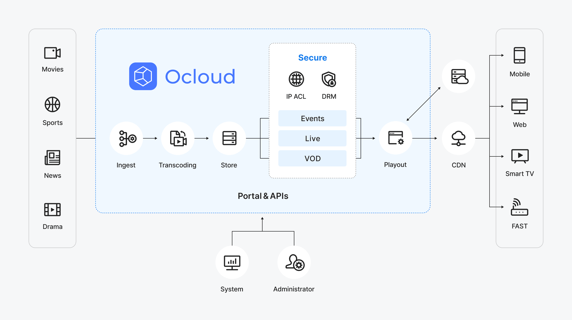 Ocloud는 LIVE/VOD 인코딩 및 패키징, AI 기반의 메타데이터 관리, 통합 CMS 운영, 실시간 스트리밍까지