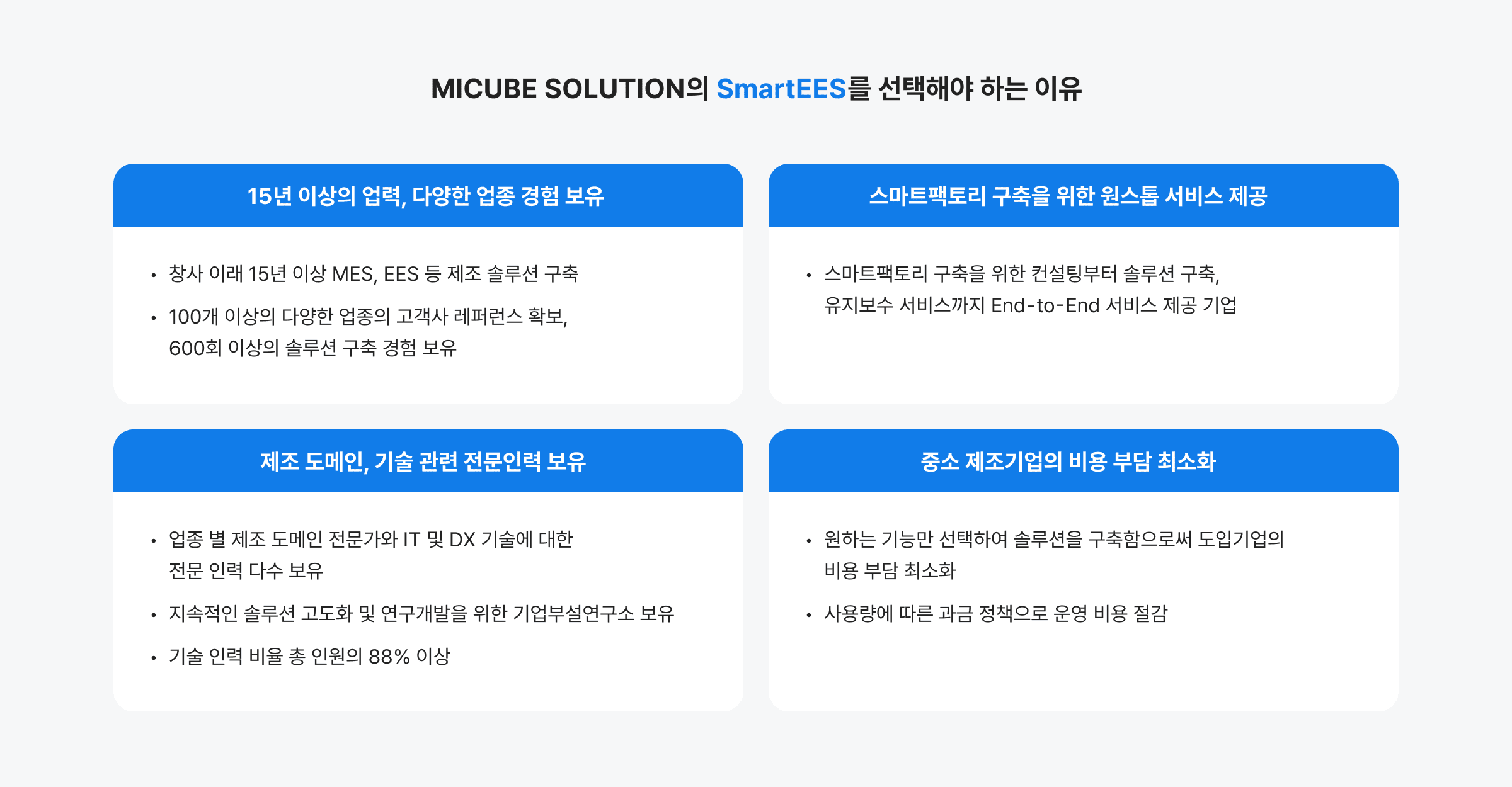 SmartEES는 e-Manufacturing을 구현하고 실행하기 위한 솔루션으로, OEE(Overall Equipment Effectiveness)를 향상하기 위한 엔지니어의 활동을 관리하는 솔루션입니다.