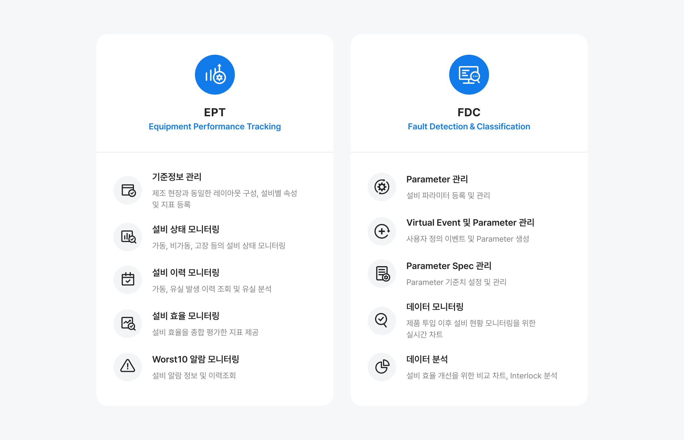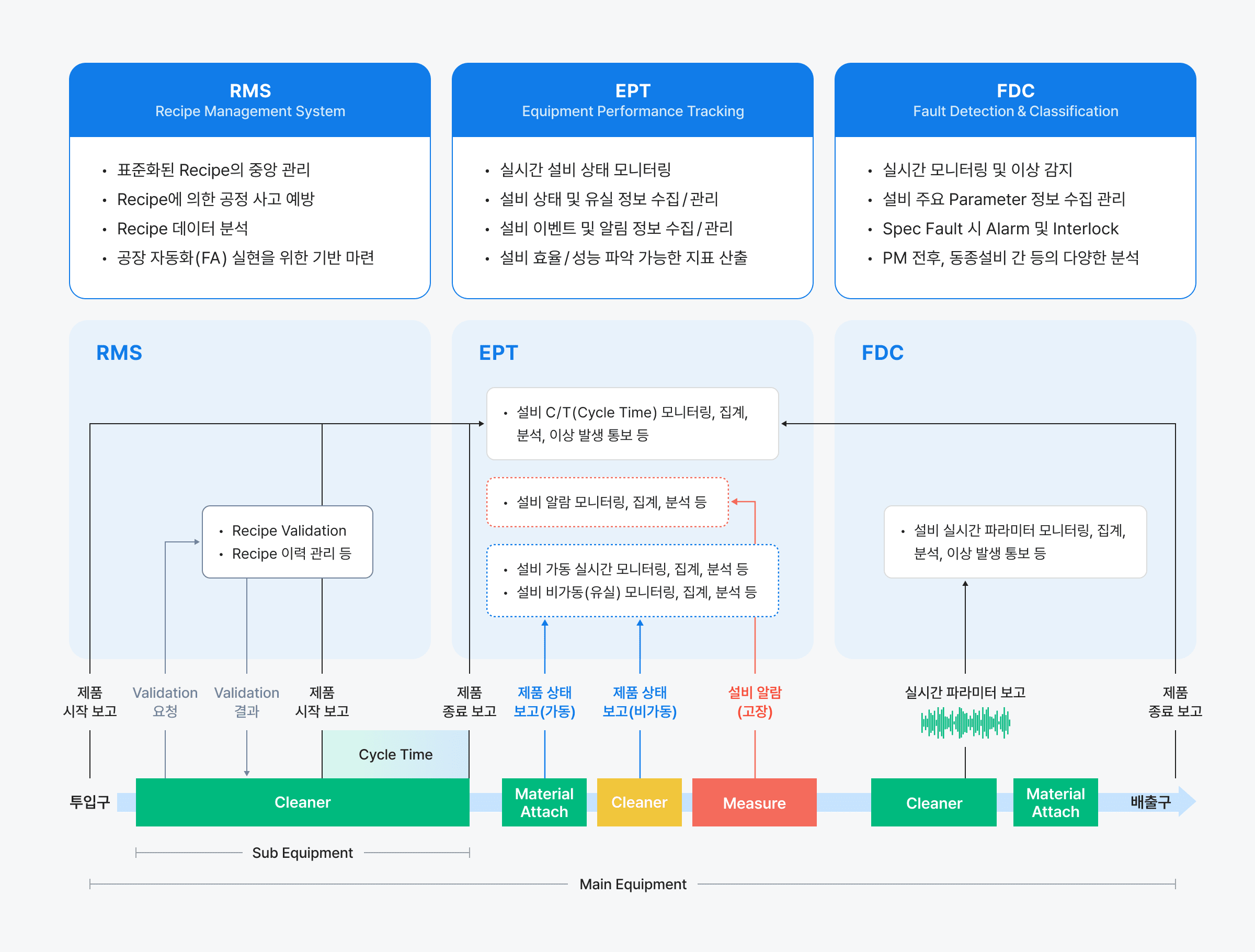 설비의 이벤트, 상태, 알람 등 실시간 모니터링을 위한 EPT(Equipment Performance Tracking), 실시간 파라미터 모니터링과 이상감지를 위한 FDC(Fault Detection & Classification)으로 구성됩니다.