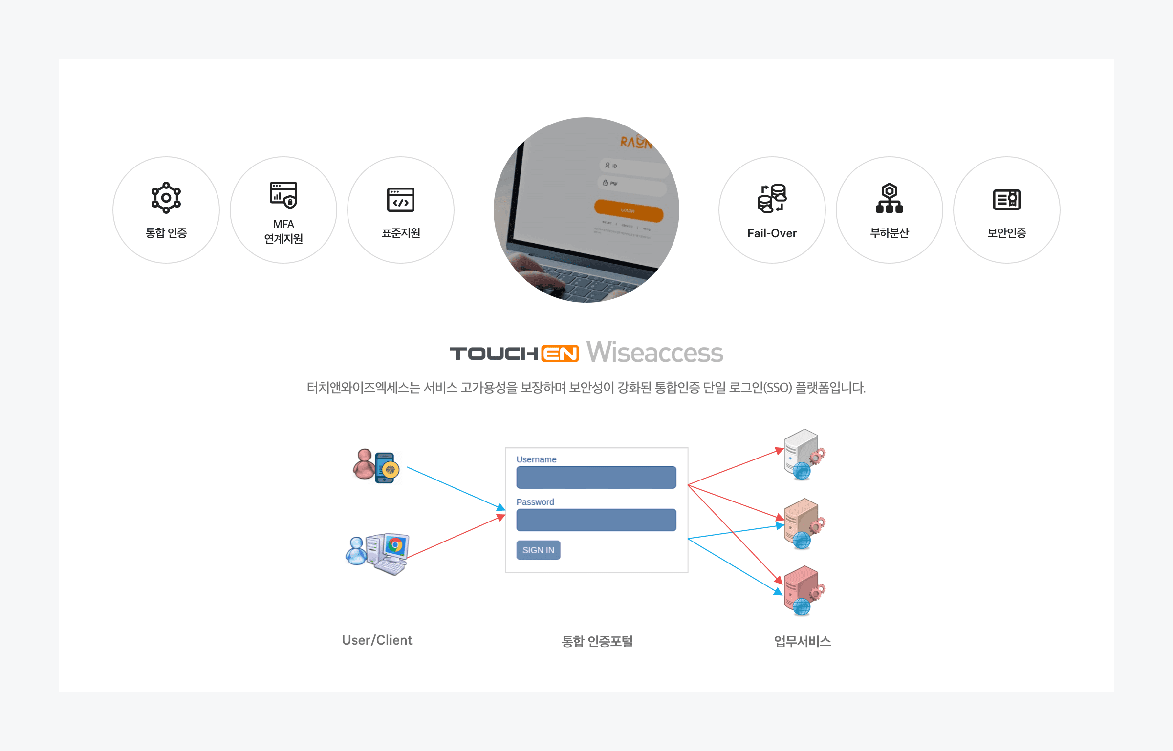 터치앤와이즈엑세스는 서비스 고가용성을 보장하며 보안성이 강화된 통합인증 단일 로그인(SSO) 플랫폼입니다.