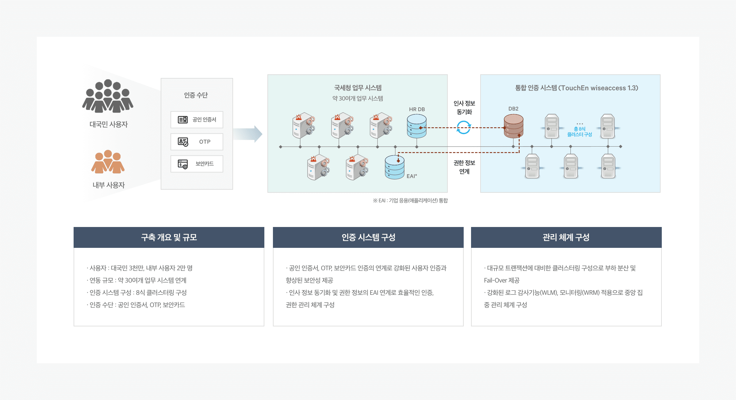 약 3천만 명의 대국민, 약 2만명의 내부 사용자가 사용하는 국세청에 적용되어 대용량 트랜잭션(Transaction) 환경에서의 성능과 안정성이 검증된 솔루션입니다.