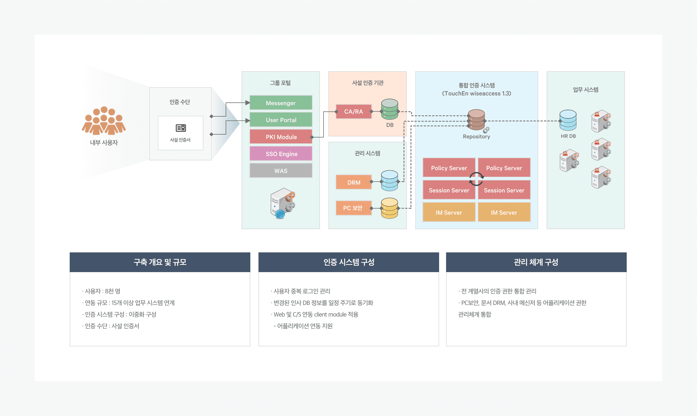 그룹사의 웹 기반 환경과 다양한 C/S 어플리케이션을 연계한 통합 계정 권한 관리 환경을 구성한 사례입니다.