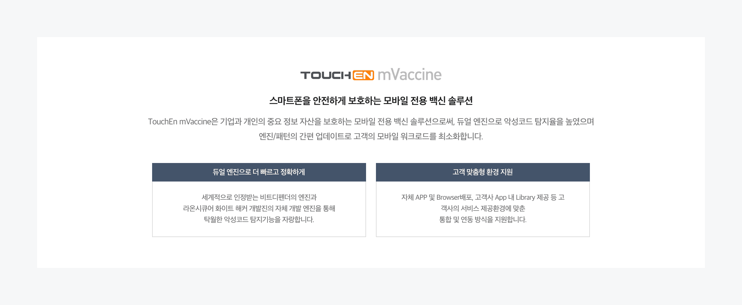 ㆍApp to App : 마켓을 통해 별도의 TouchEn mVaccine 앱을 설치 후 고객사의 APP서비스와 연동하여 사용합니다.
