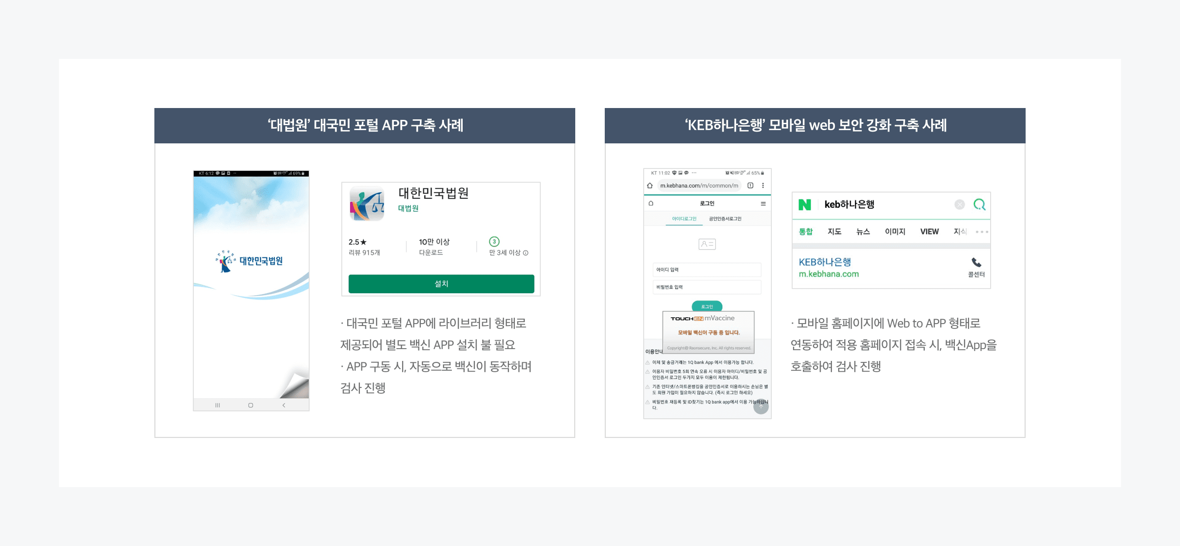 ㆍWeb to App : 마켓을 통해 별도의 TouchEn mVaccine 앱을 설치 후 고객사의 웹서비스와 연동하여 사용합니다.