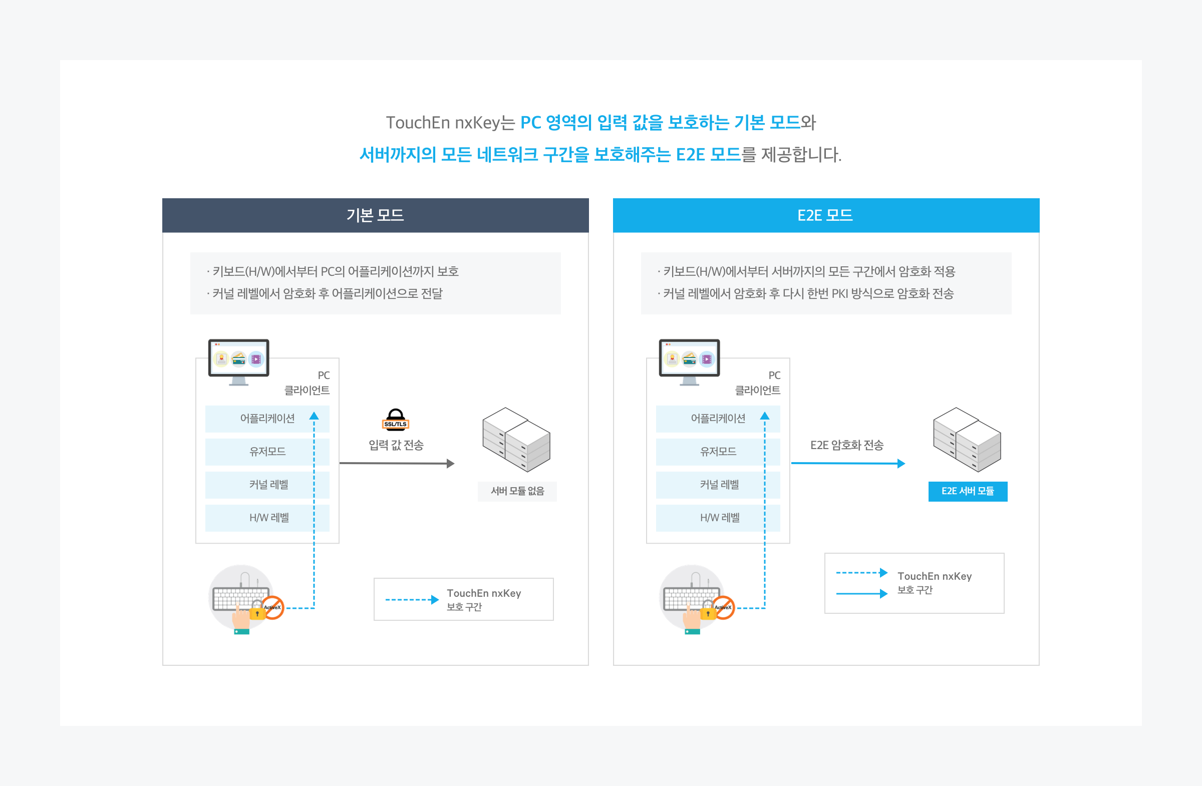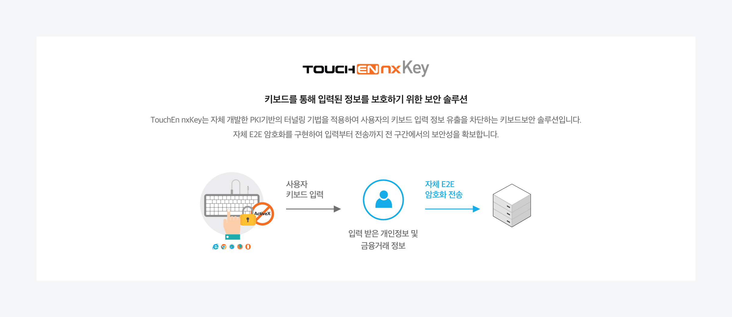 TouchEn nxKey는 자체 개발한 PKI기반의 터널링 기법을 적용하여 사용자의 키보드 입력 정보 유출을 차단하는 키보드보안 솔루션입니다.