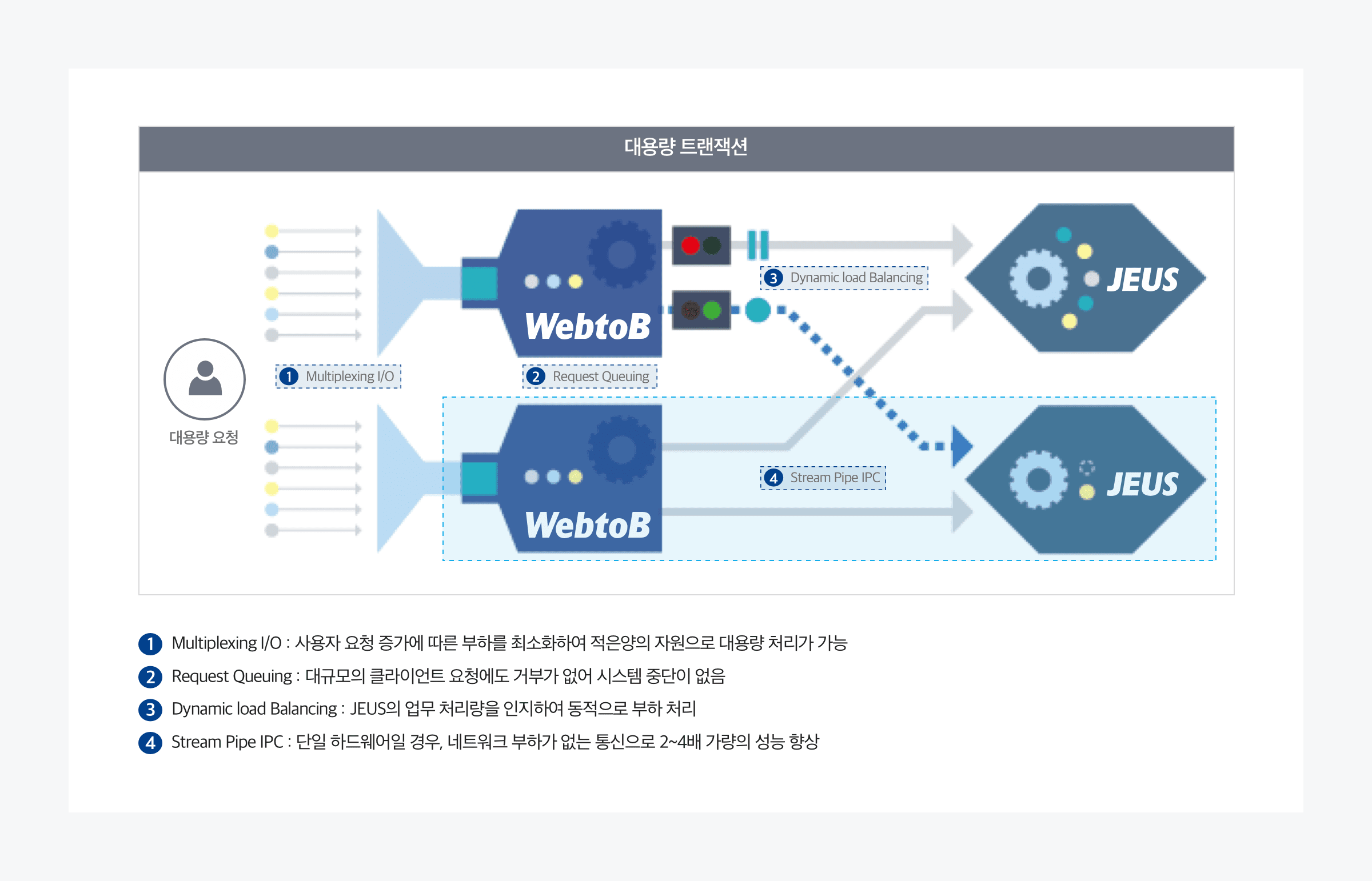 WebtoB는 웹의 HTTP를 사용하여 웹 페이지가 들어 있는 파일을 사용자들에게 제공하는 웹 서버입니다. 기존 웹 서버가 가지고 있는 구조적인 문제를 혁신적으로 개선하여 성능 및 안전성에서 탁월한 기능을 제공합니다. 또한 웹상에서의 대규모 트랜잭션 처리에 적합하도록 설계되어 처리 속도 지연, 서버 다운 등 웹 시스템의 문제들을 효과적으로 해결합니다.