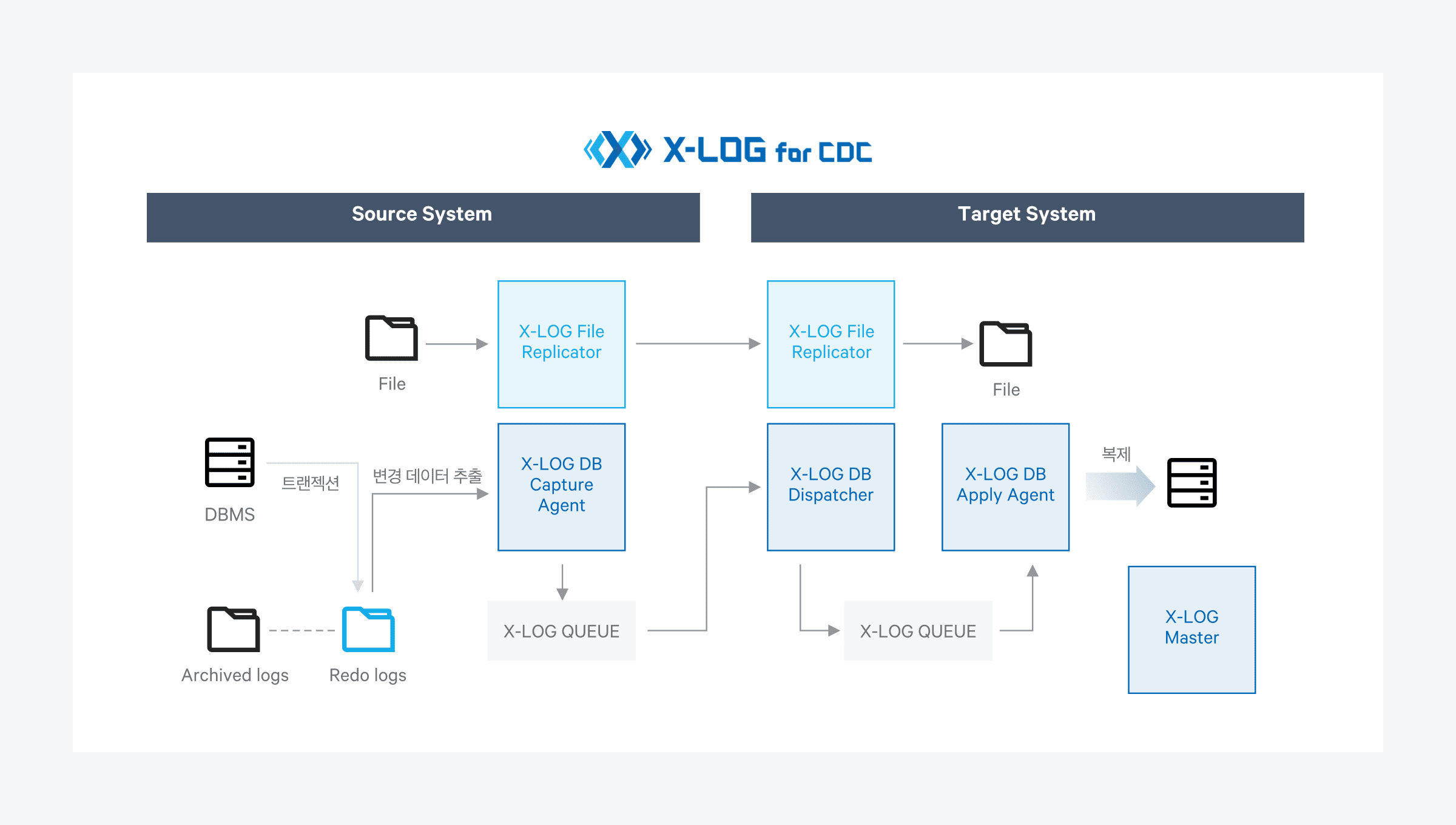 * X-LOG for CDC는 변경 데이터의 실시간 복제 서비스를 제공하며, 초기 데이터 이관이 필요한 경우에는 X-LOG for IDL 서비스를 이용하실 수 있습니다.