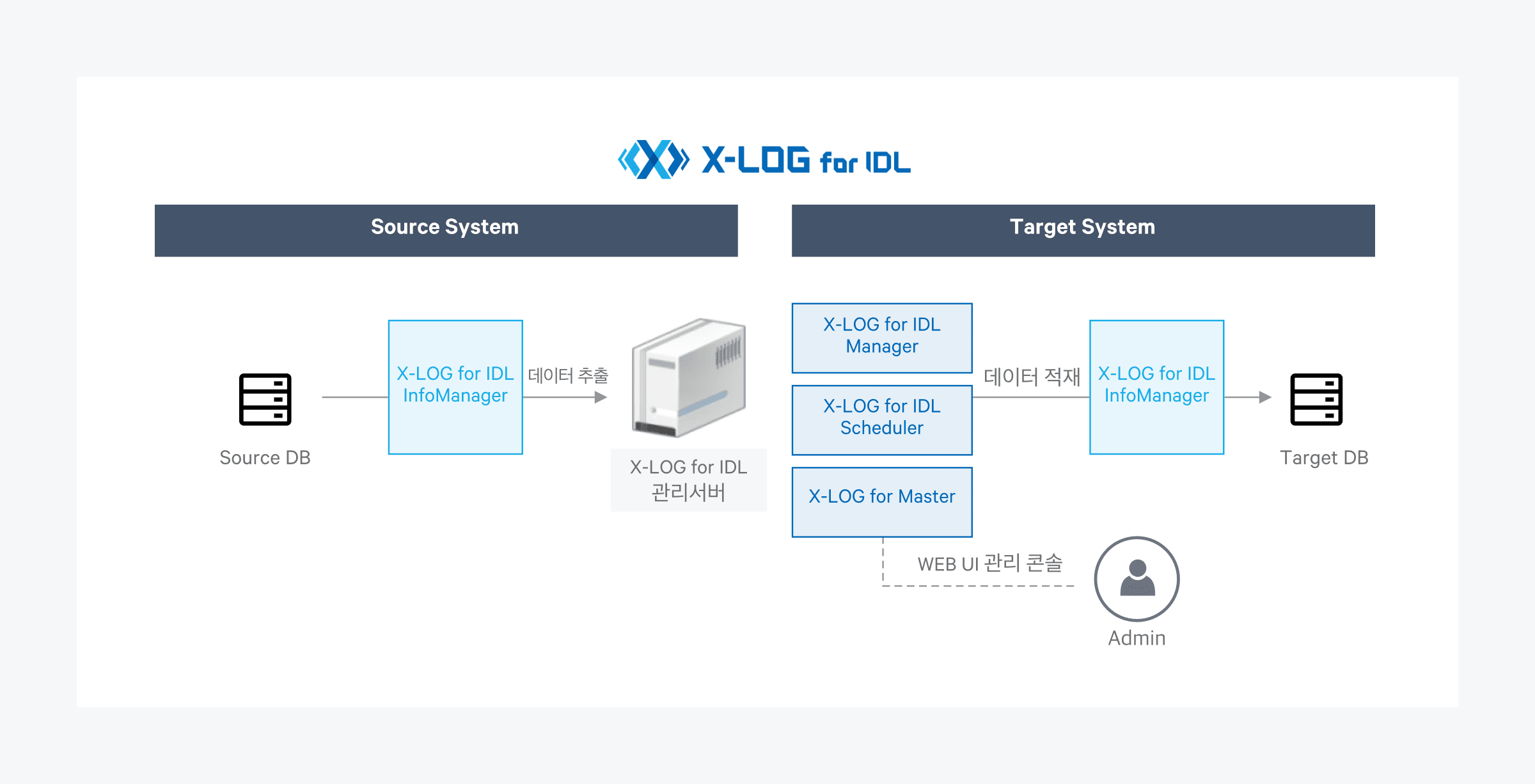* X-LOG for IDL은 데이터 이관 서비스를 제공하며 이후 지속적인 실시간 복제가 필요한 경우에는 X-LOG for CDC 서비스를 이용하실 수 있습니다.
