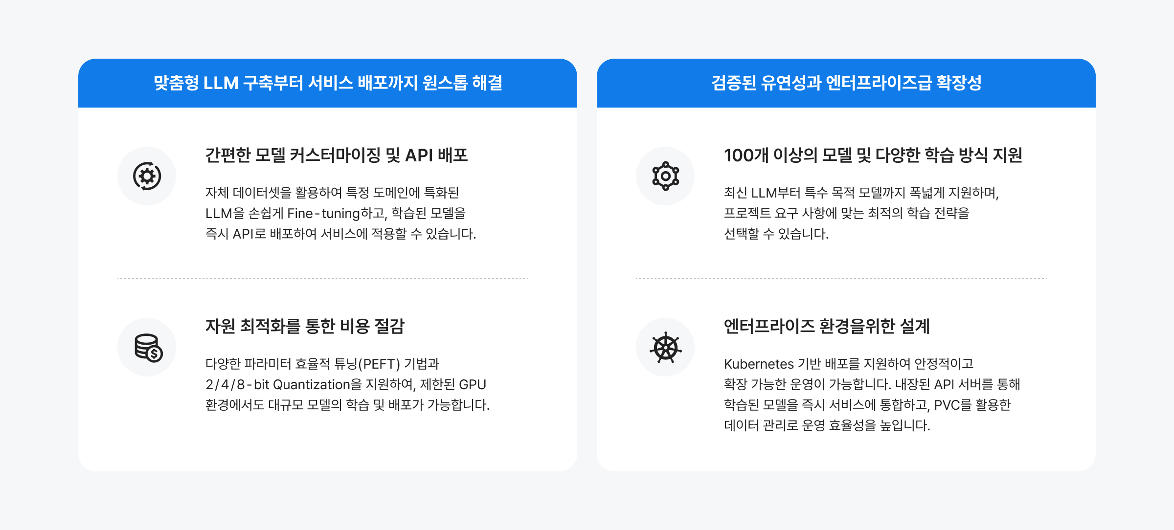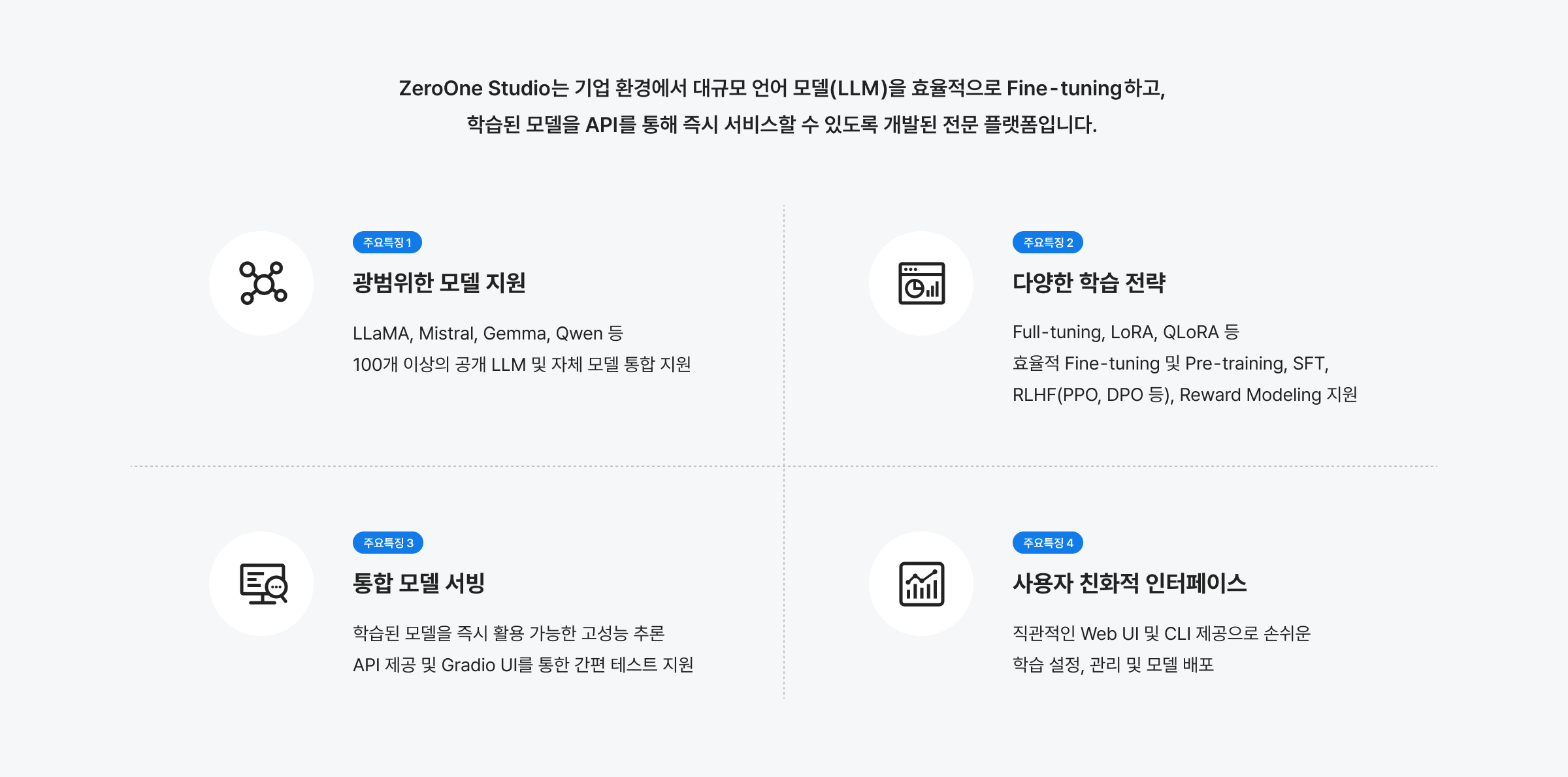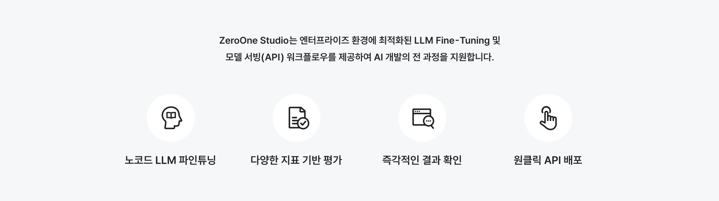 강력한 LLM Fine-Tuning 및 서빙 환경 ZeroOne Studio는 엔터프라이즈 환경에 최적화된 LLM Fine-Tuning 및 모델 서빙(API) 워크플로우를 제공하여 AI 개발의과정을 지원합니다.