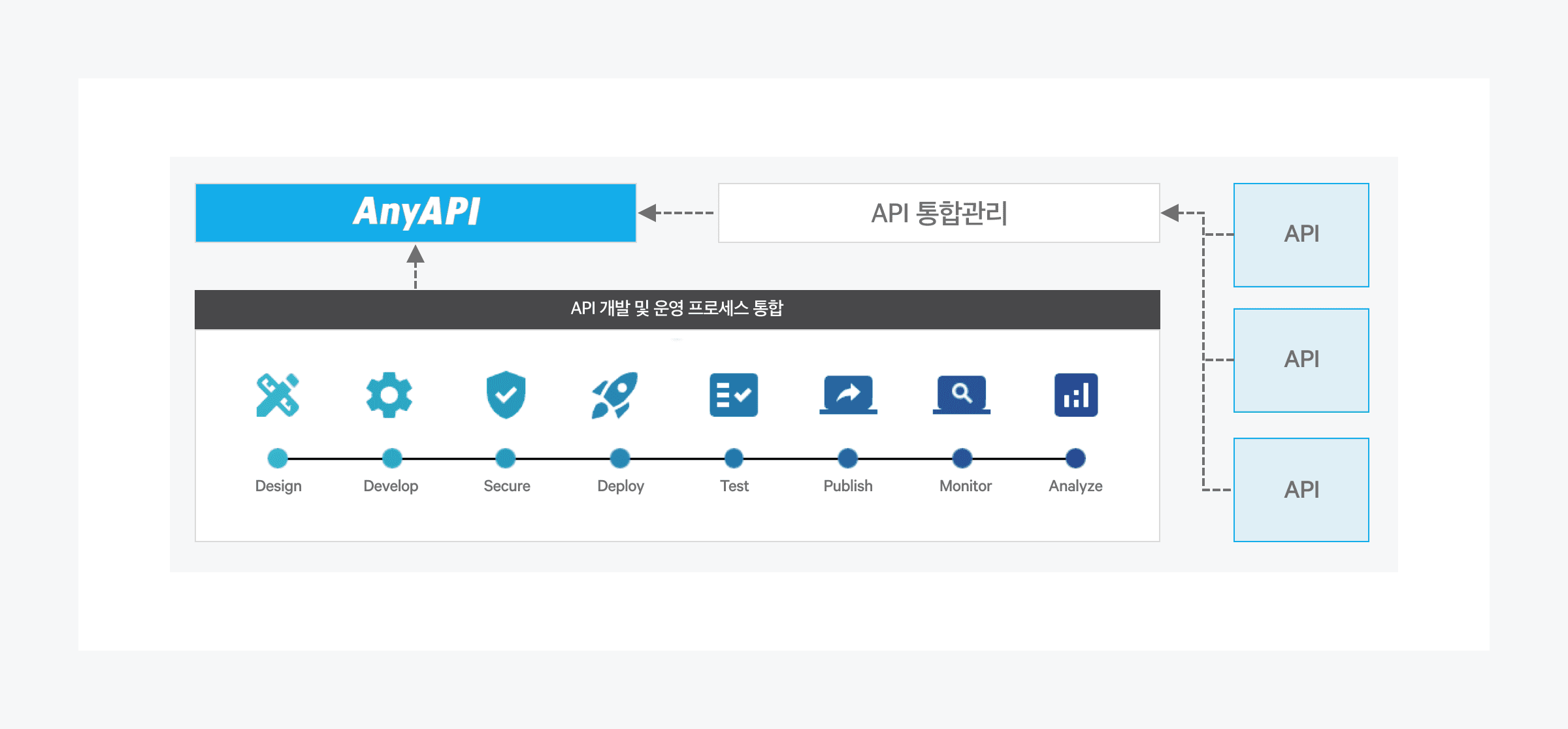 AnyAPI는 온프레미스 및 클라우드 환경으로 운영되는 API를 Front단에서 End-Point로 통합하여 API 설계, 개발, 유지, 관리를 지원하는 API 통합 관리 솔루션입니다.