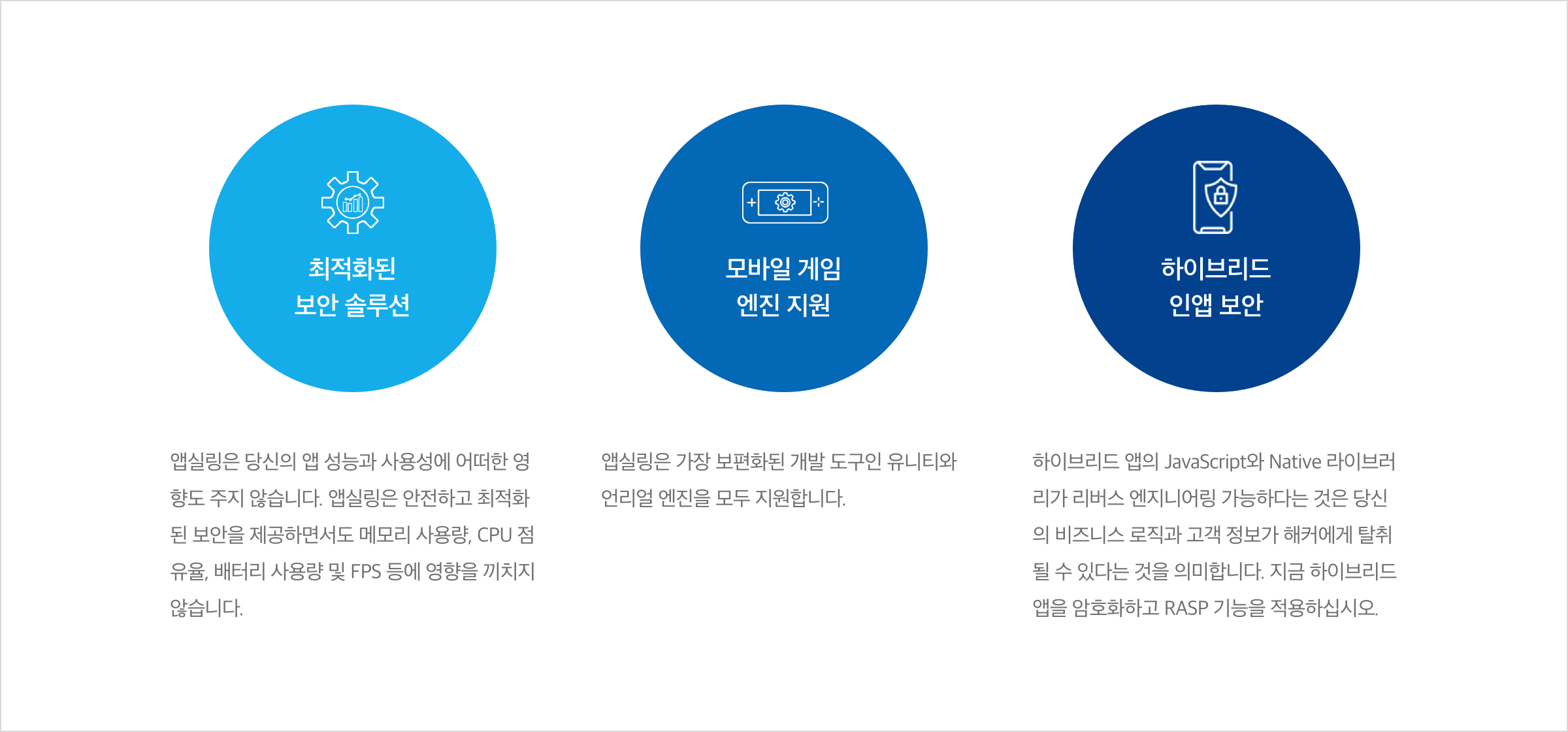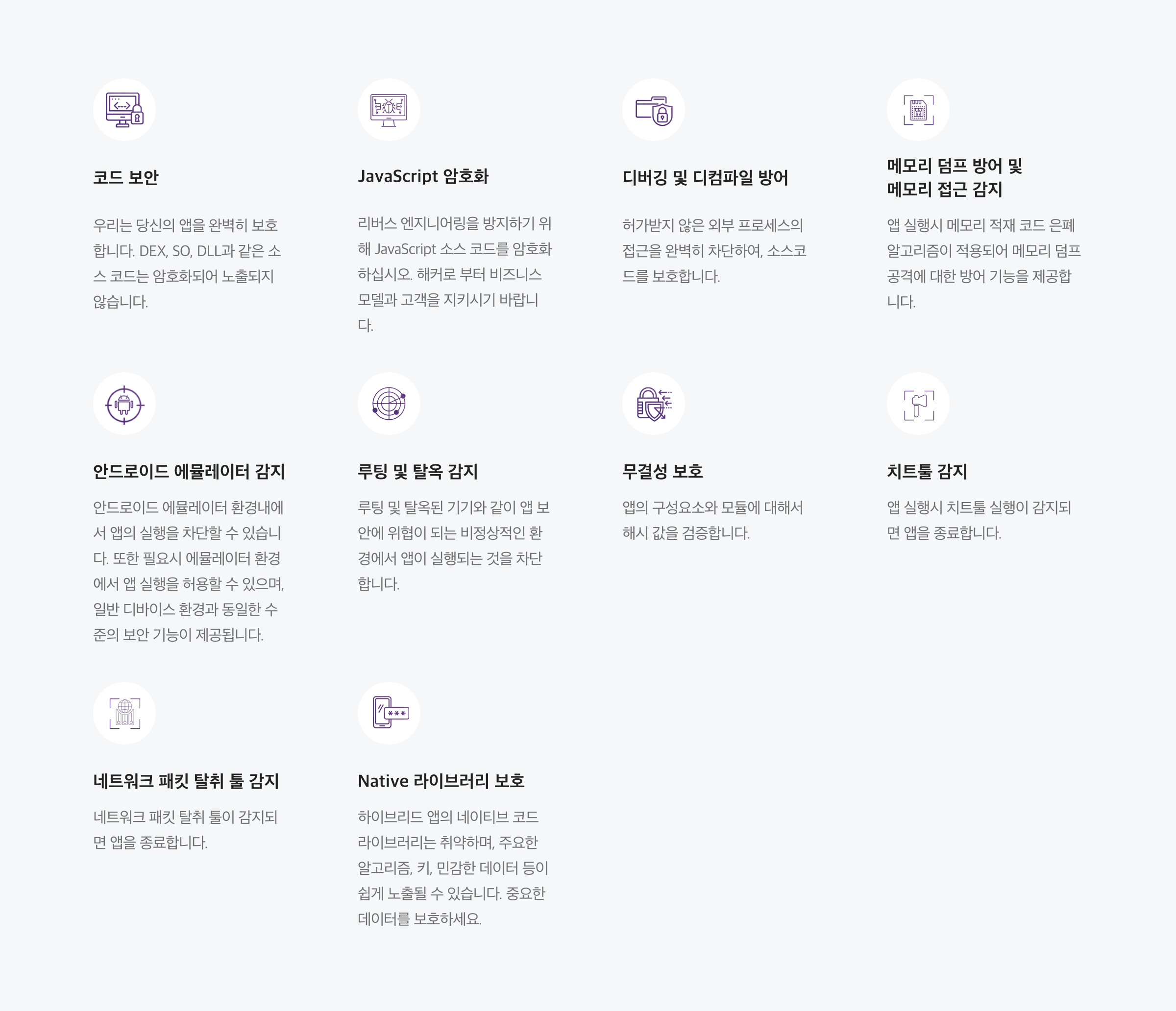 소스 코드 보안, 위변조 감지, 안티 디버깅, 안티 디컴파일, 네트워크 패킷 위변조 툴 감지, 게임 치트툴 감지 기능을 제공합니다.