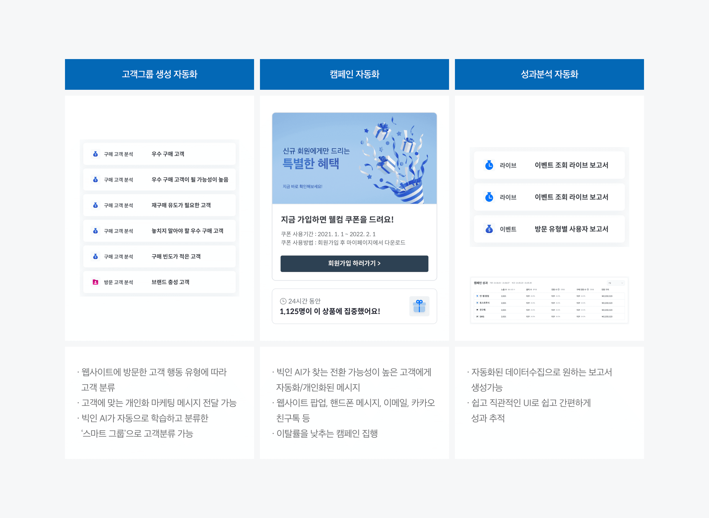 고객행동단계(사이트 방문 – 상세페이지 조회- 장바구니 담기 – 체크아웃 – 구매하기) 에서 수집한 행동 데이터를 기반으로 아래 기능을 자동화하여 마케터의 반복적인 업무를 덜어줍니다.