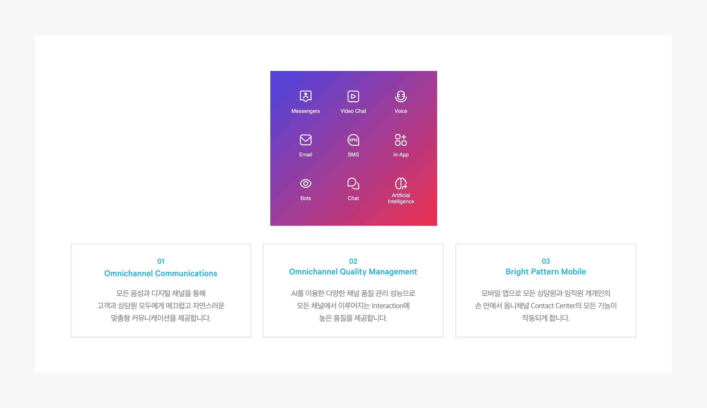 Bright Pattern은 업계에서 가장 빠르고, 비용 효율적으로 배포 할 수 있는, 간단하지만 강력한 옴니채널 Contact Center 솔루션으로, 음성, 텍스트, 채팅, 이메일, 동영상, 메신저, AI 및 봇 등 여러 채널을 망라하는 가장 진보된 옴니채널 클라우드 플랫폼입니다. Bright Pattern은 귀사에서 운영하는 모든 채널에서 이루어지는 Interaction을 평가할 수 있는  옴니채널 품질 관리 기능을 제공합니다. 또한 귀사의 어떤 직원이라도 고객과 바로 소통이 가능 하도록 모바일 앱을 제공합니다. 26개국 500여개 고객사를 보유한 Bright Pattern은 업계의 분석 전문가 집단과 고객 리뷰에서 최고의 평가를 받는 옴니채널 Contact Center 솔루션입니다.