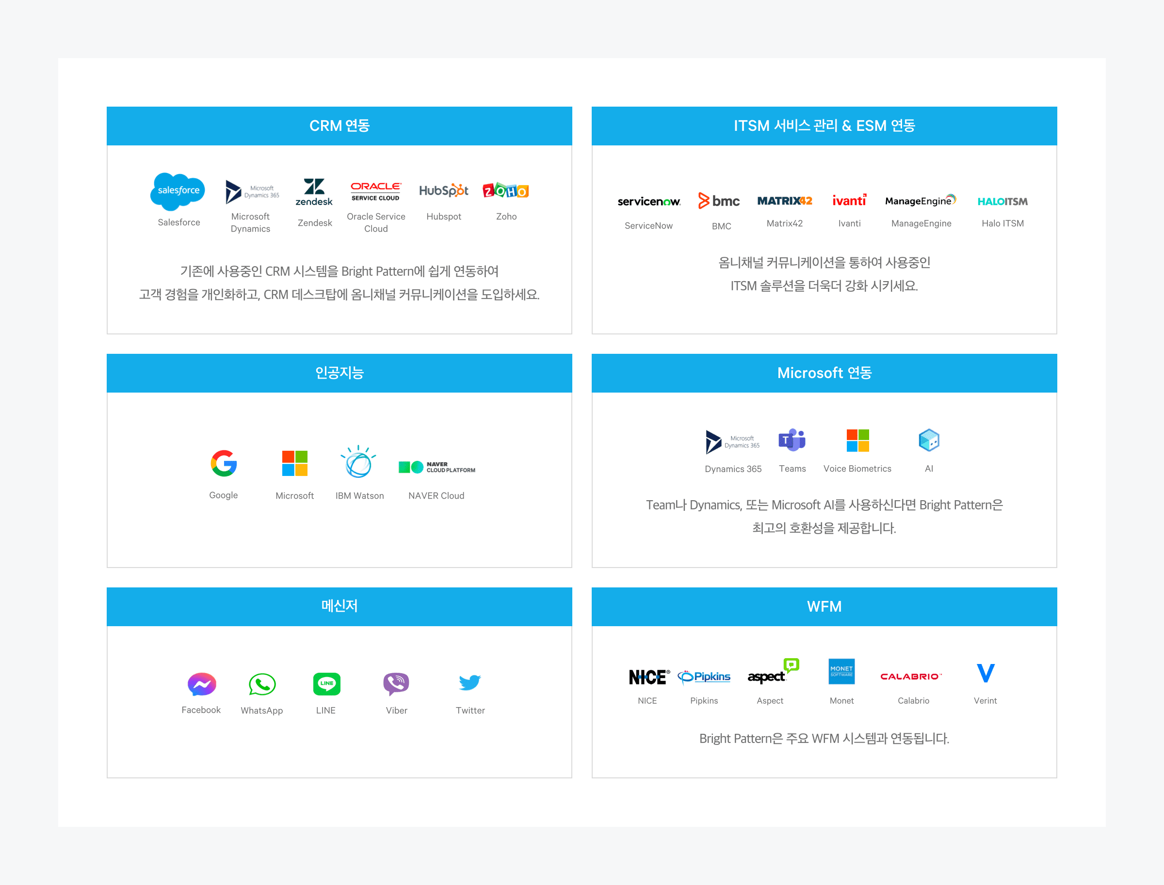 Bright Pattern은 귀사의 기존 CRM 시스템 또는 다양한 CRM 시스템과도 매끄럽게 연동 됩니다. 또한 고객 데이터 및 과거 Interaction 내역을 기반으로 고객 데이터와 인사이트를 활용할 수 있습니다. 사용자는 즉각적으로 데이터를 조회하여 고객에게 개인화된 경험을 제공할 수 있습니다. 또한 Bright Pattern은 Microsoft Dynamics 365, Salesforce, Oracle Service Cloud, ServiceNow, Zendesk 등 주요 CRM 시스템도 매끄럽게 연동 됩니다. CRM 시스템을 사용함으로써 업무 흐름을 효율화하고, 영업 현황을 추적하고, 고객의 동향을 기록하며 효율적인 고객 지원이 가능합니다. CRM 연동을 통해 업무 효율성을 끌어올려 더 많은 영업 기회를 얻고 고객 충성도를 증가시킬 수 있습니다.