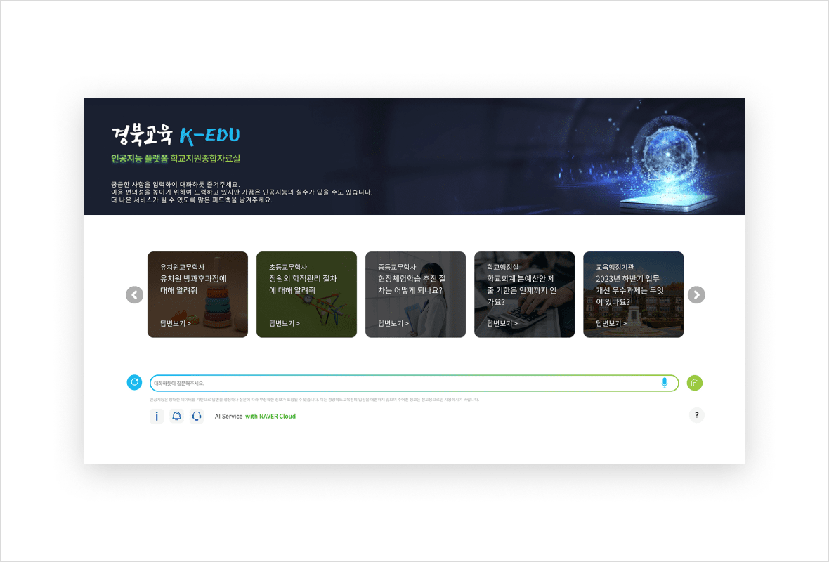· 경북교육청內 학교지원종합자료실 매뉴에 대한 전체 데이터(인사, 법규, 학사, 행정 등)를 학습하여 교사, 초등학생, 학부모 등 AI 서비스를 이용하여 빠르고 정확한 정보 제공
