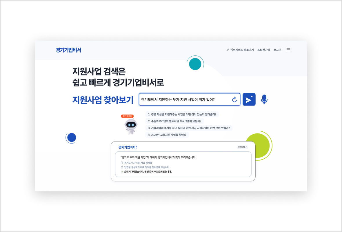 · 경기도內 지원사업을 사업자(개인)분들께 빠르고 정확한 정책을 제공 및 추천함으로써 맞춤형 지원사업 제공