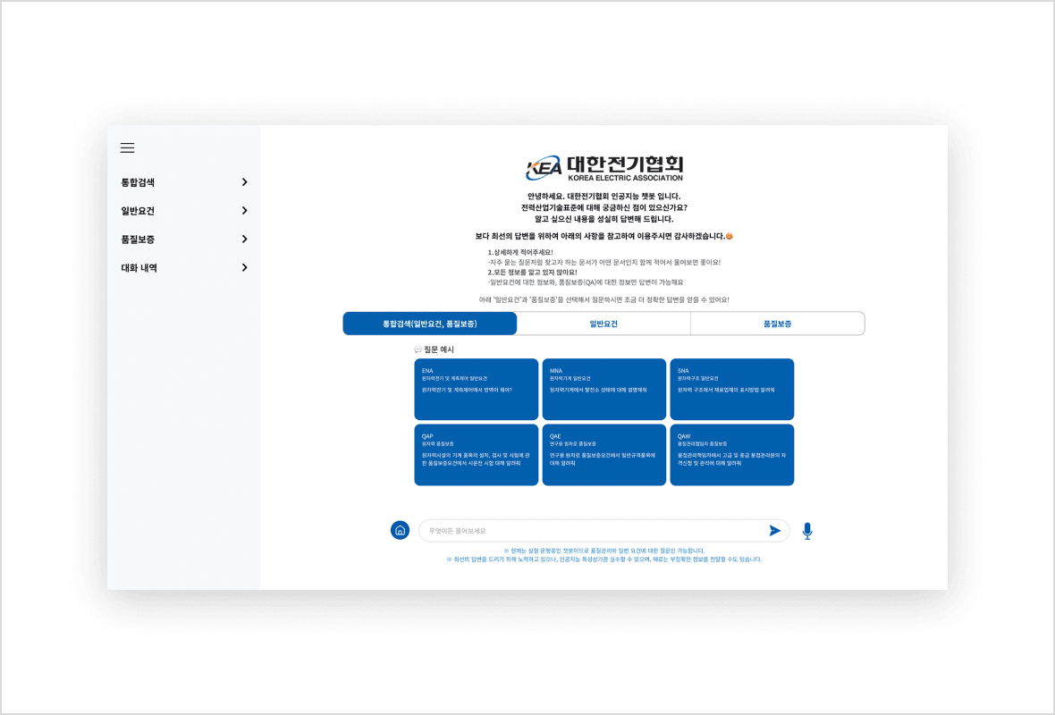 · 사용자는 웹서비스를 이용한 챗봇으로 질문과 답변을 할 수 있으며, 관리자는 대시보드, 사용자관리, 통계, 데이터관리 등의 메뉴를 통해서비스를 운영할 수 있습니다.