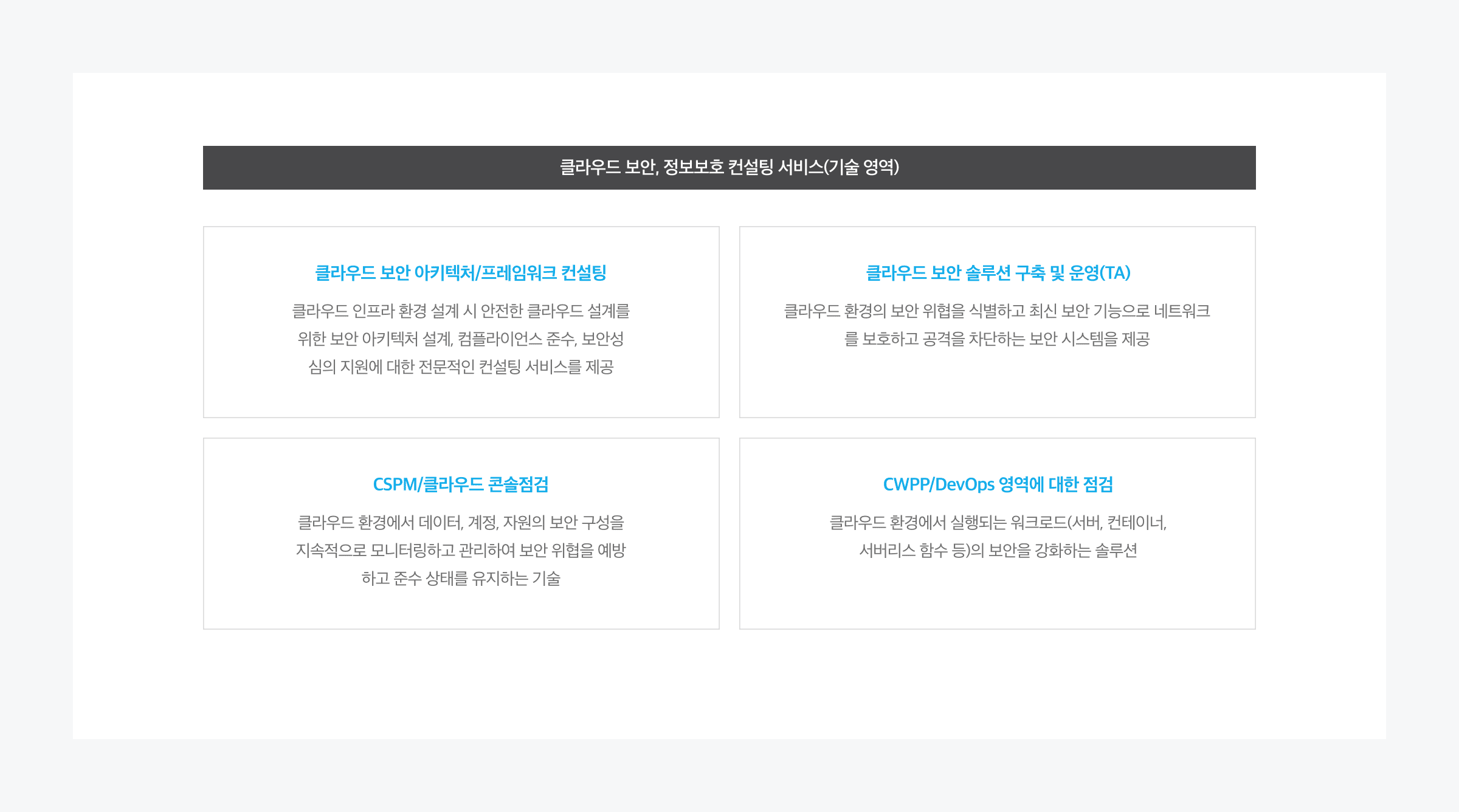 클라우드  컴플라이언스 준수 및 보안수준 향상을 위한 클라우드 정보보호 관리체계 방향성을 제시하고, 클라우드 환경에서 발생 가능한 위협 요인 식별 및 클라우드 환경 전반의 안전성 점검을 진행합니다.