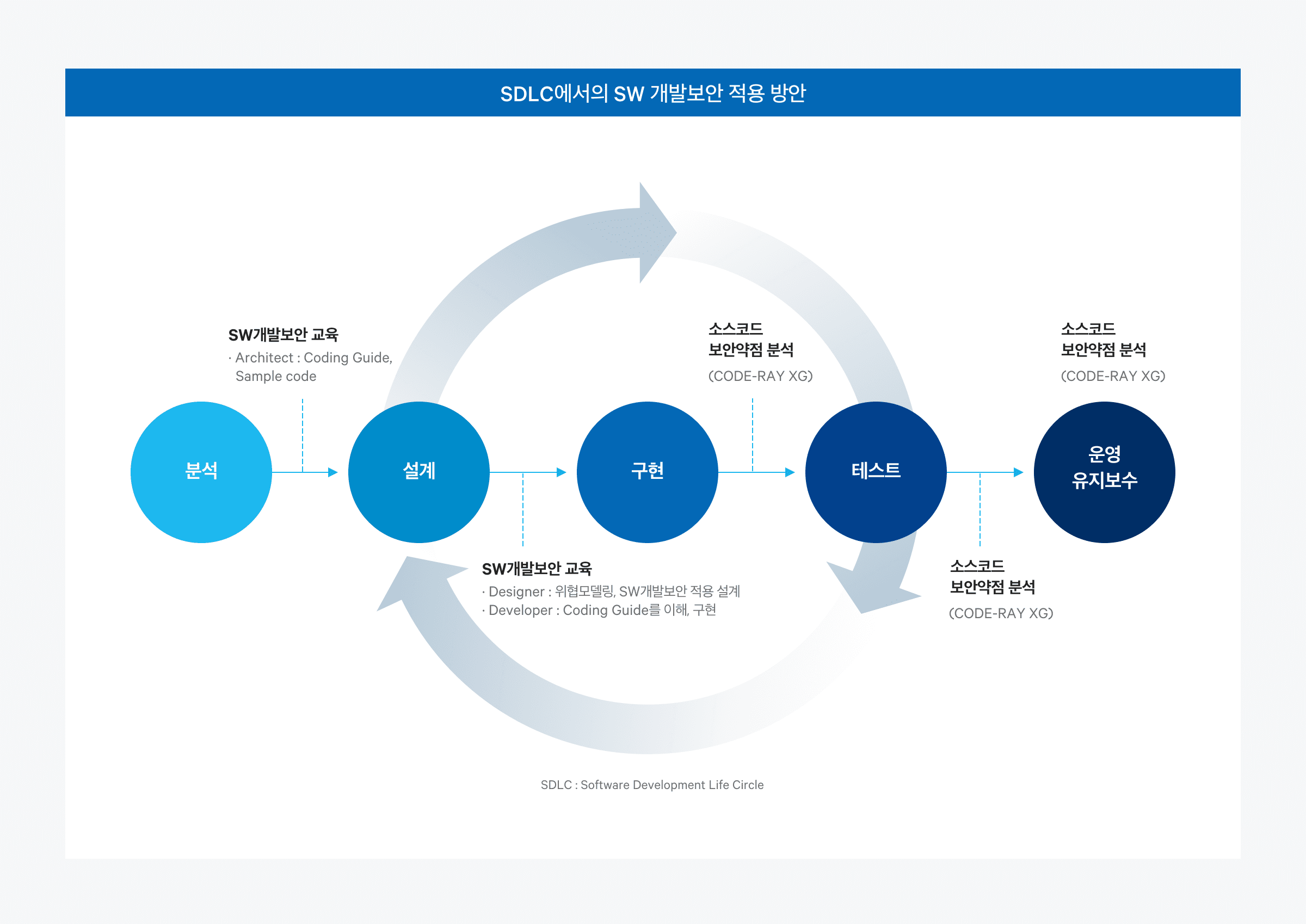 CODE-RAY XG V6.0은 ‘소스코드 개발보안 솔루션‘으로 SW 개발공정 단계(SDLC)에서 발생할 수 있는 소스코드의 보안약점을 관리하기 위해 소스코드 보안약점 분석, 형상관리 연동, 프로젝트 통합관리 등의 기능을 제공합니다.