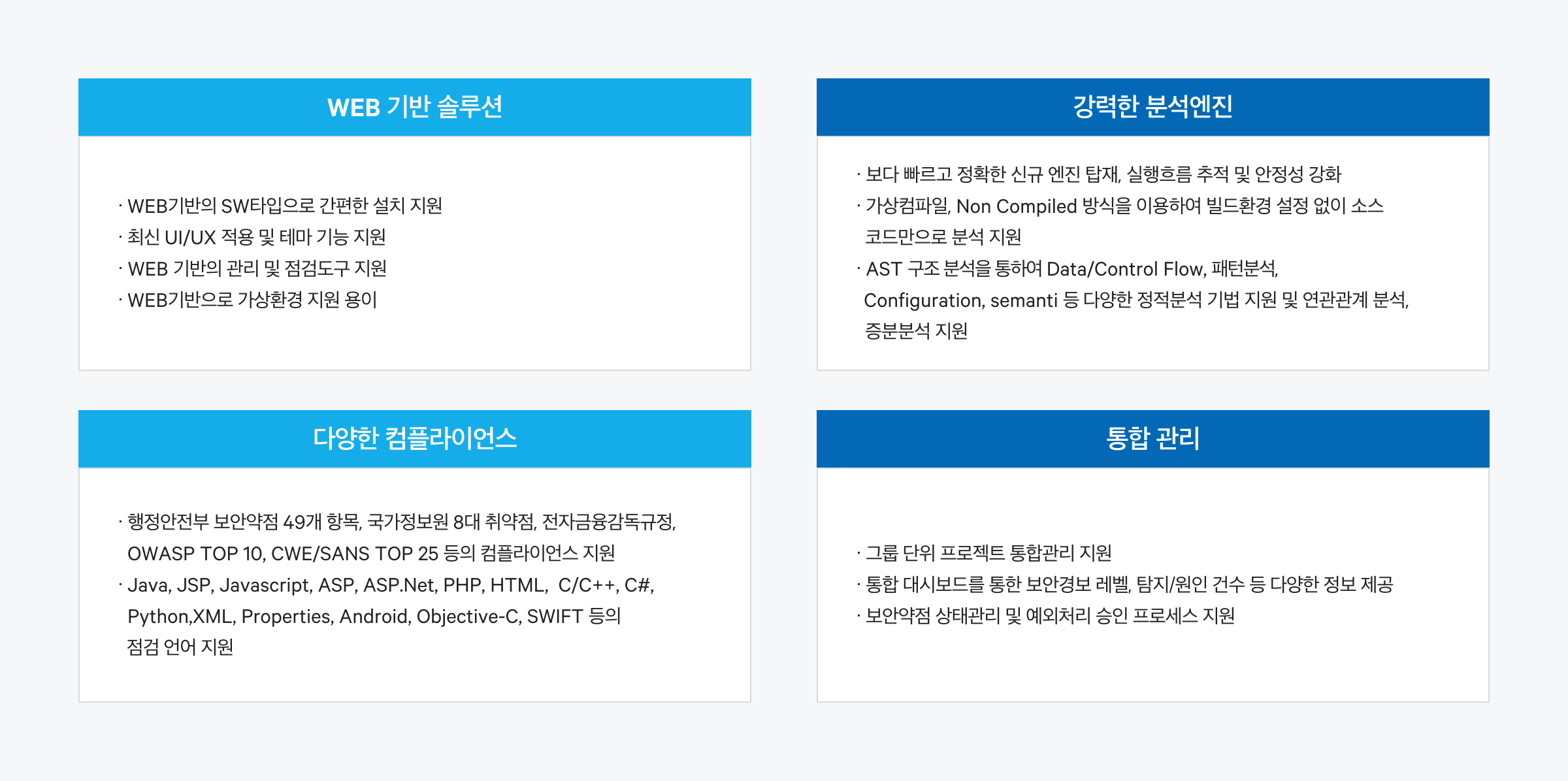 CODE-RAY XG V6.0은 WEB기반의 솔루션으로서 강력한 분석엔진을 탑재하고 다양한 점검 언어와 점검 컴플라이언스를 지원합니다.
