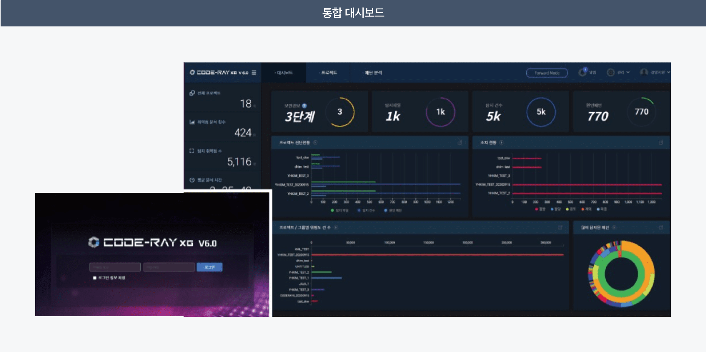 탐지된 보안약점의 효율적인 분석결과 관리를 위하여 통합 대시보드, 프로젝트 대시보드를 제공합니다.