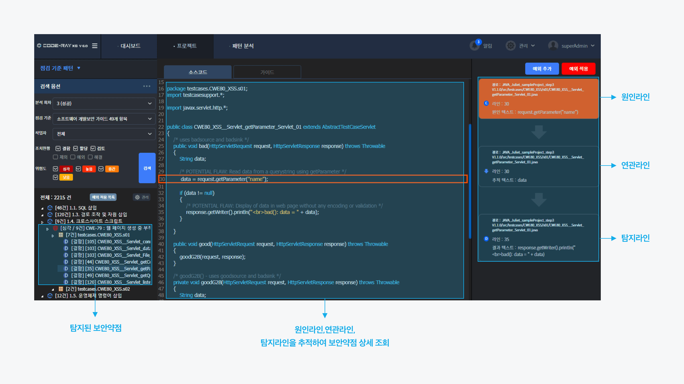 탐지된 보안약점에 대하여 정/오탐 판단이 용이한 보안약점 추적 네비게이션 기능을 제공합니다.