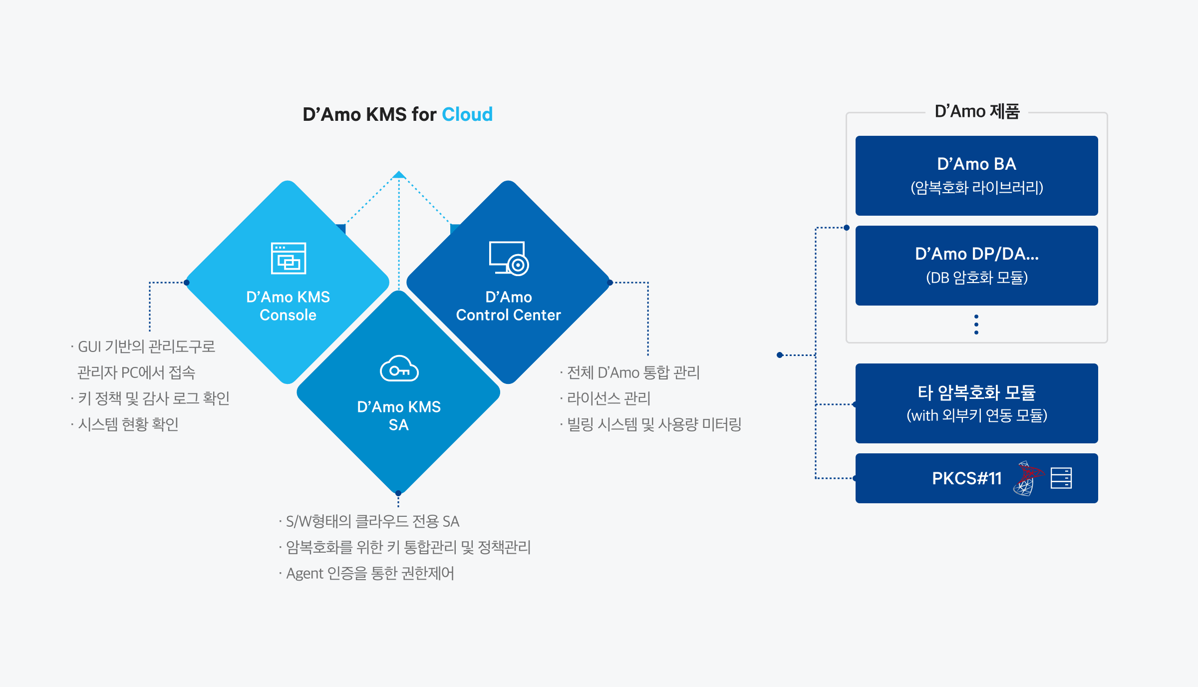 D’Amo는 D’Amo KMS for Cloud + D’Amo 암호화 제품으로 구성되어 있습니다.
