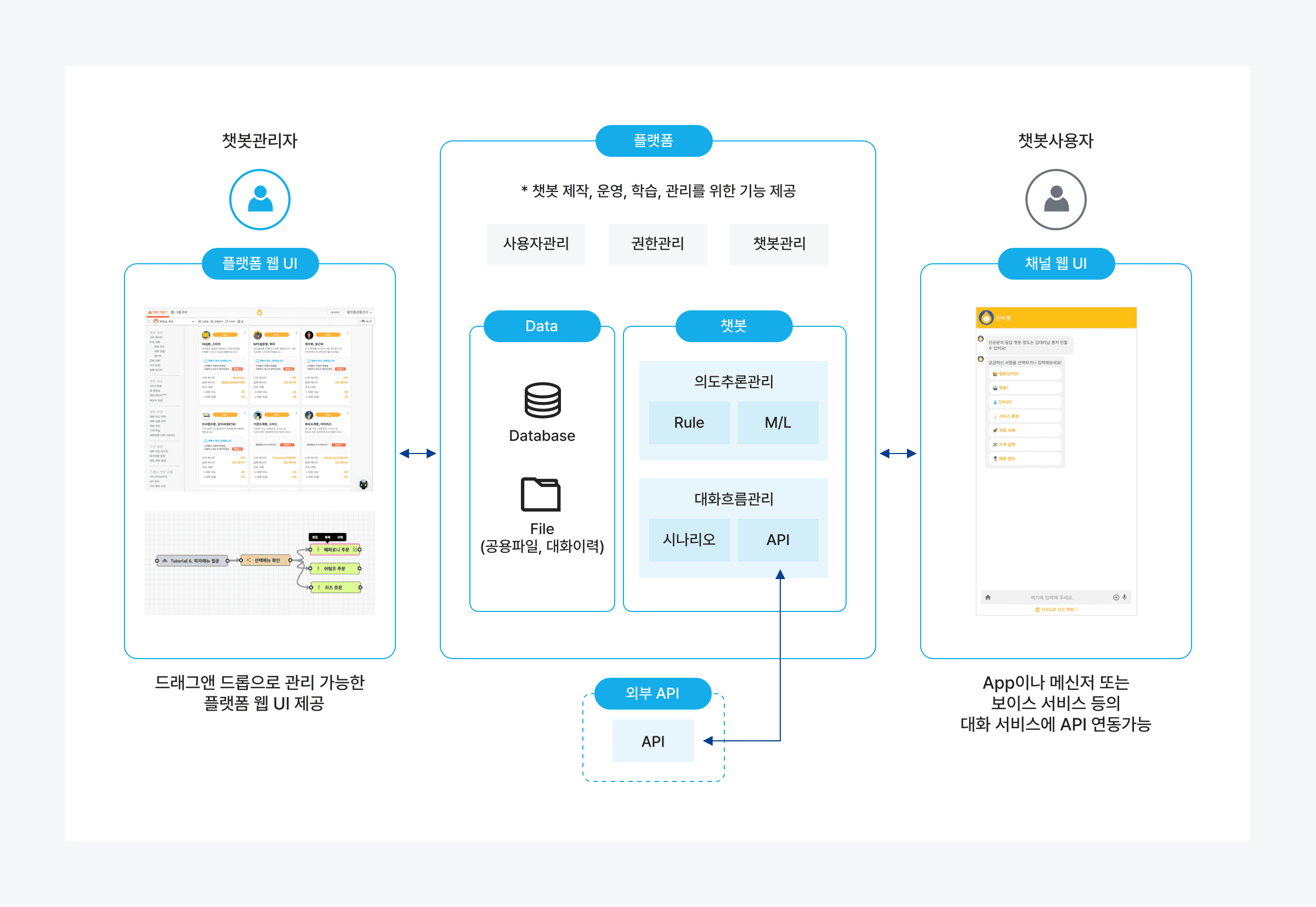 단비Ai는 챗봇관리자가 직접 챗봇을 생성하고 운영할 수 있는 플랫폼과 일반 사용자가 대화창을 통해 챗봇을 사용할 수 있는 채널 서비스로 구성되어 있습니다.