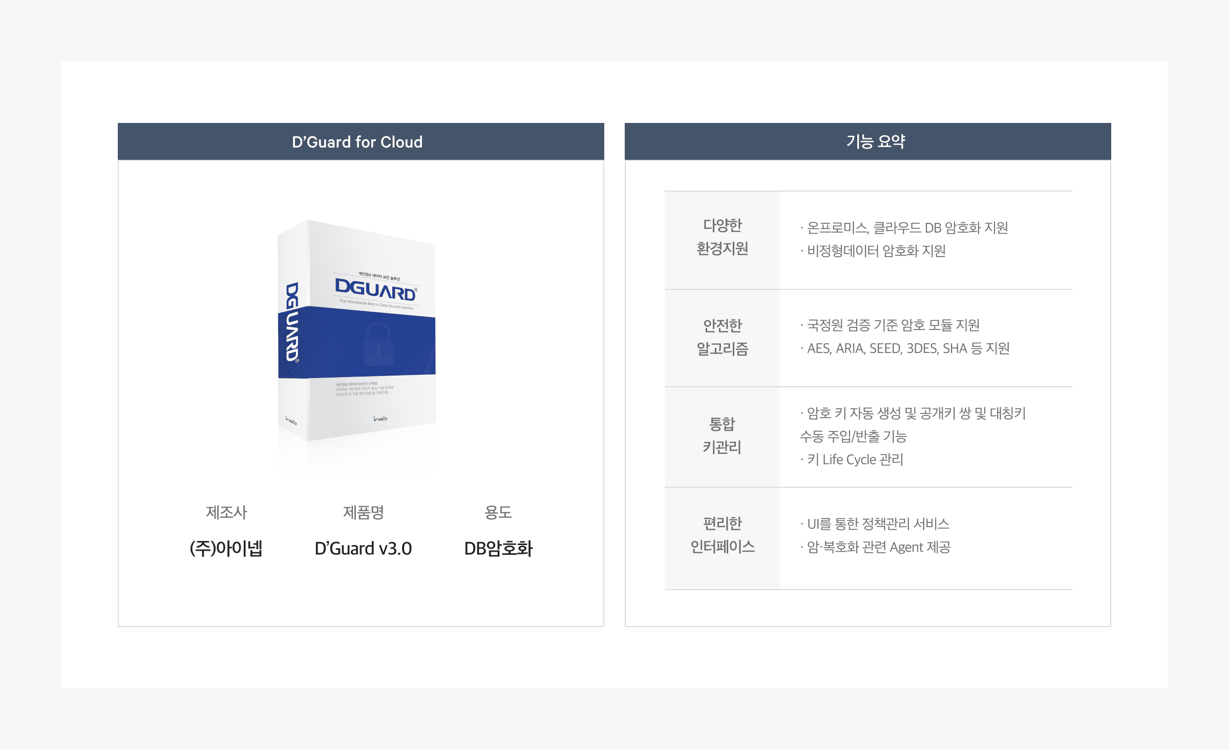 제품은 DB암호화, 비정형데이터 암호화 등 다양한 개인정보암호화를 제공합니다.
