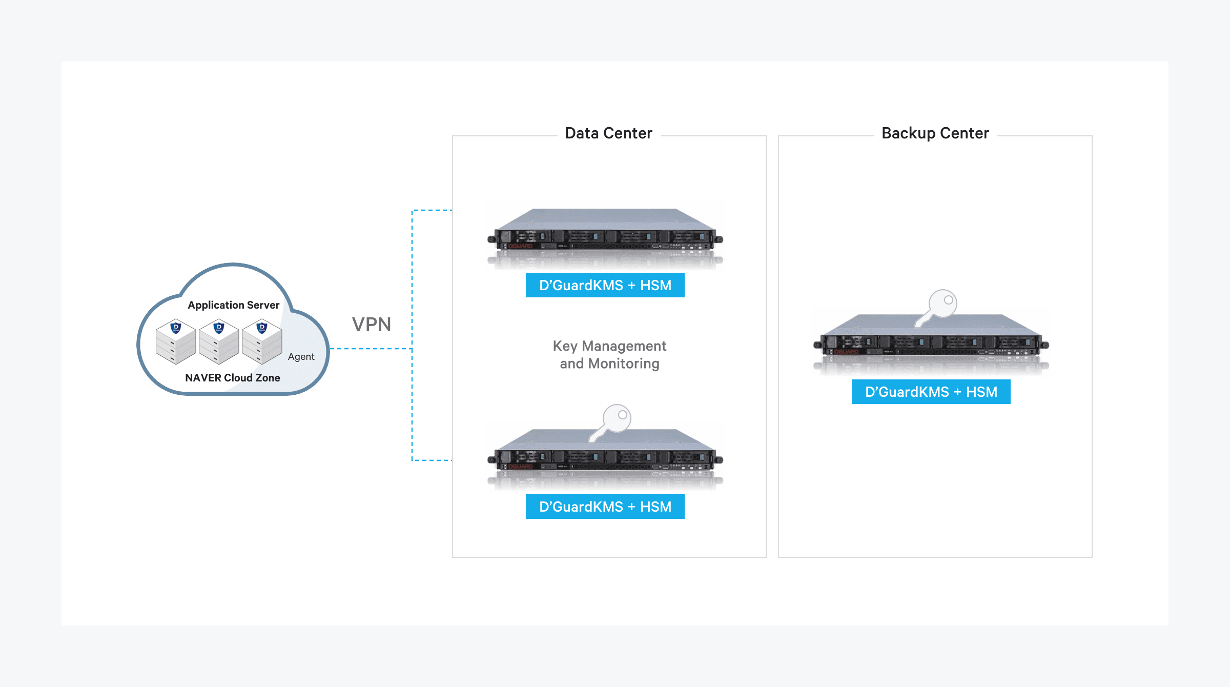 제품은 클라우드 환경에서 암호화 Agent 만 클라우드 상에 설치되며, 키 관리 및 키 저장은 기존의 H/W를 이용 혹은 새로운 H/W의 구매를 통해 온프로미스에서 안전하게 운영되는 환경을 제공합니다.