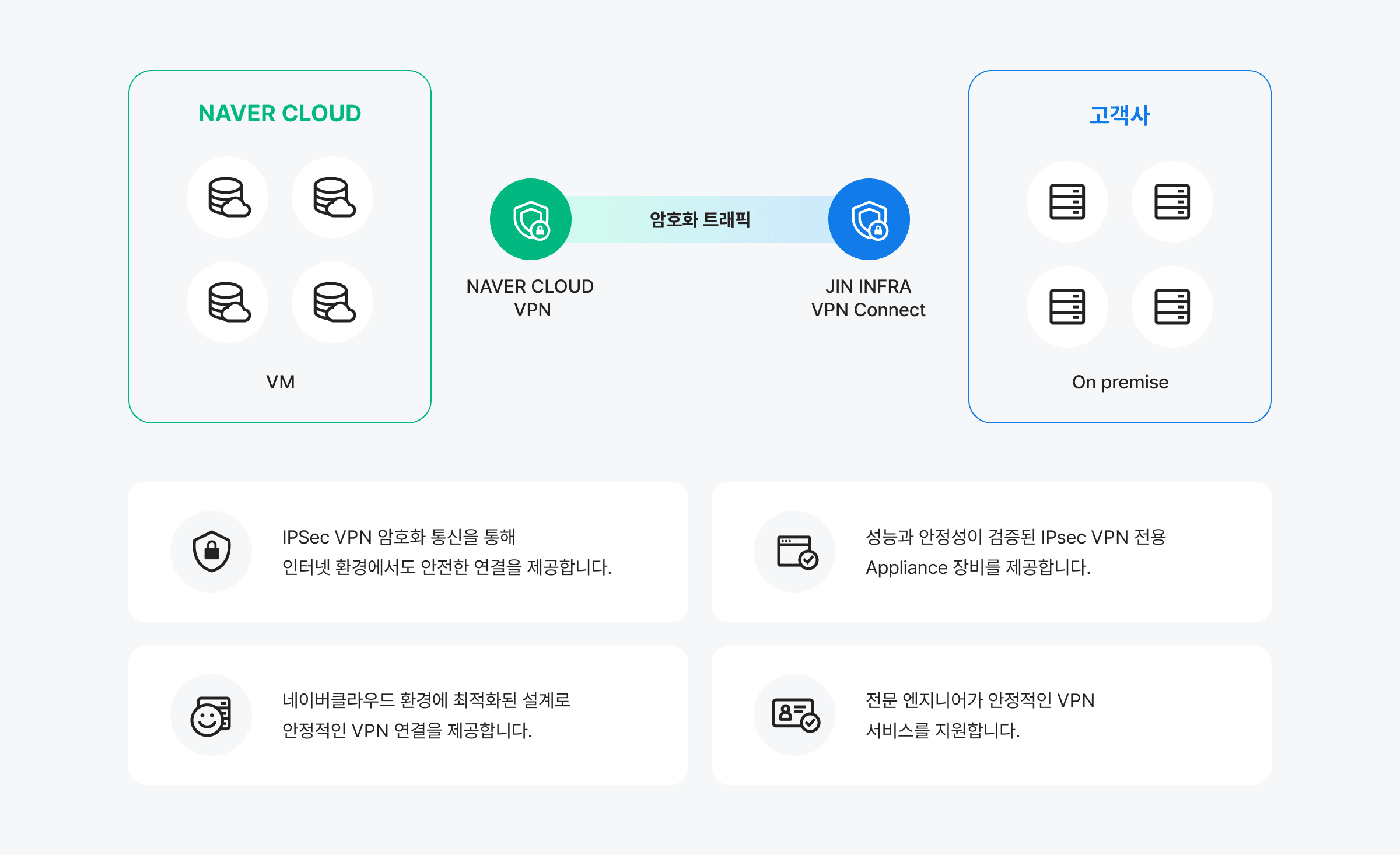 JIN INFRA VPN Connect 서비스는 다양한 벤더 장비와 전문 기술 지원을 기반으로, 네이버클라우드에 최적화된 안전한 IPSec VPN 연결을 제공하는 맞춤형 임대 서비스입니다.