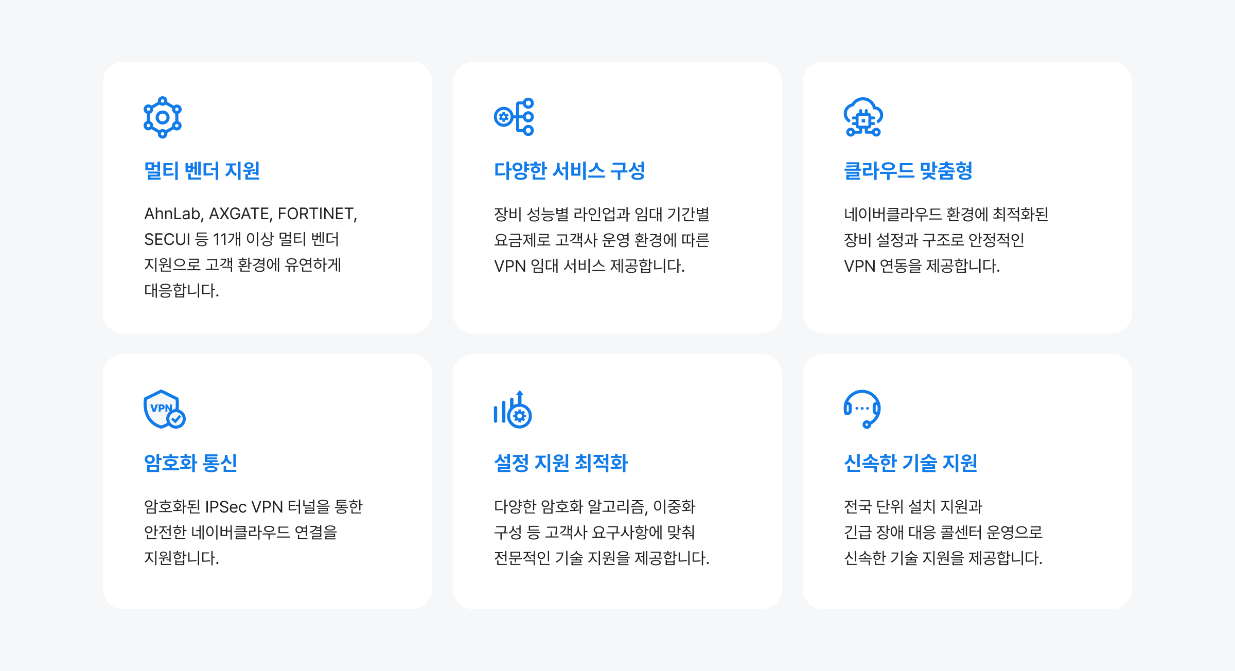 ※ 본 서비스에서 제공하는 장비 사양은 각 벤더사의 공식 스펙을 기준으로 하며, 실제 성능은 고객사의 네트워크 환경, 설정 조건 등에 따라 달라질 수 있습니다.