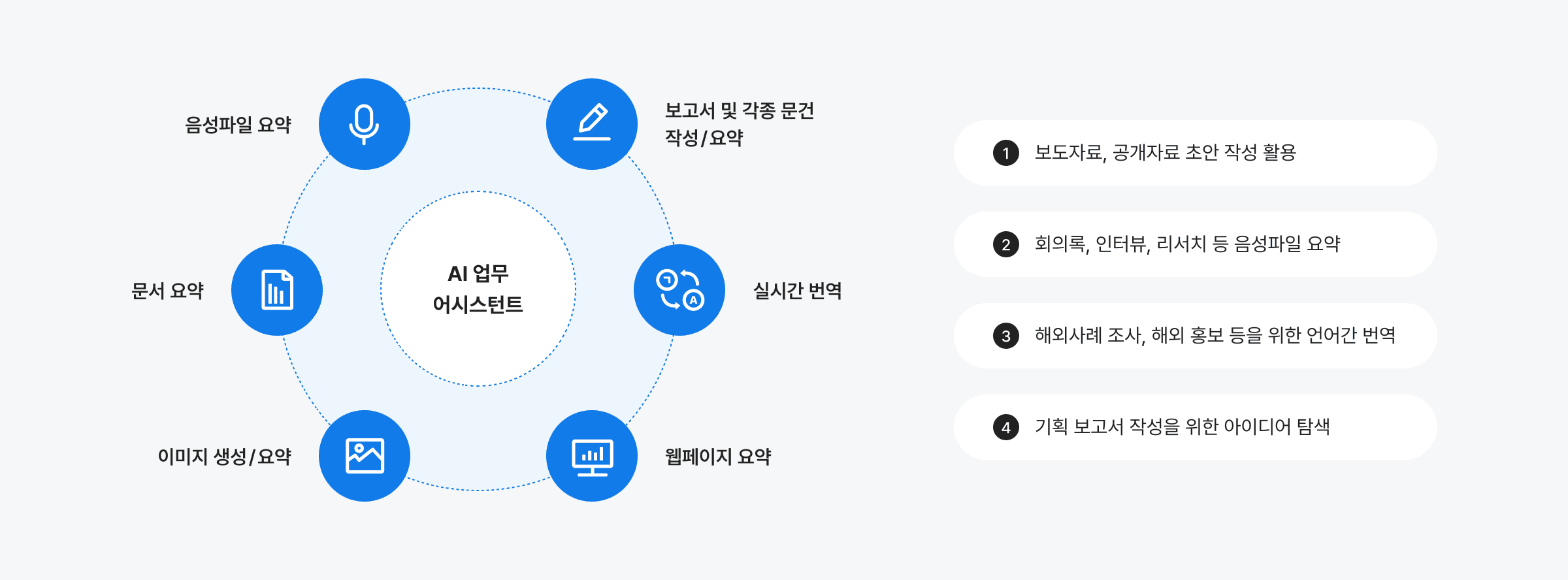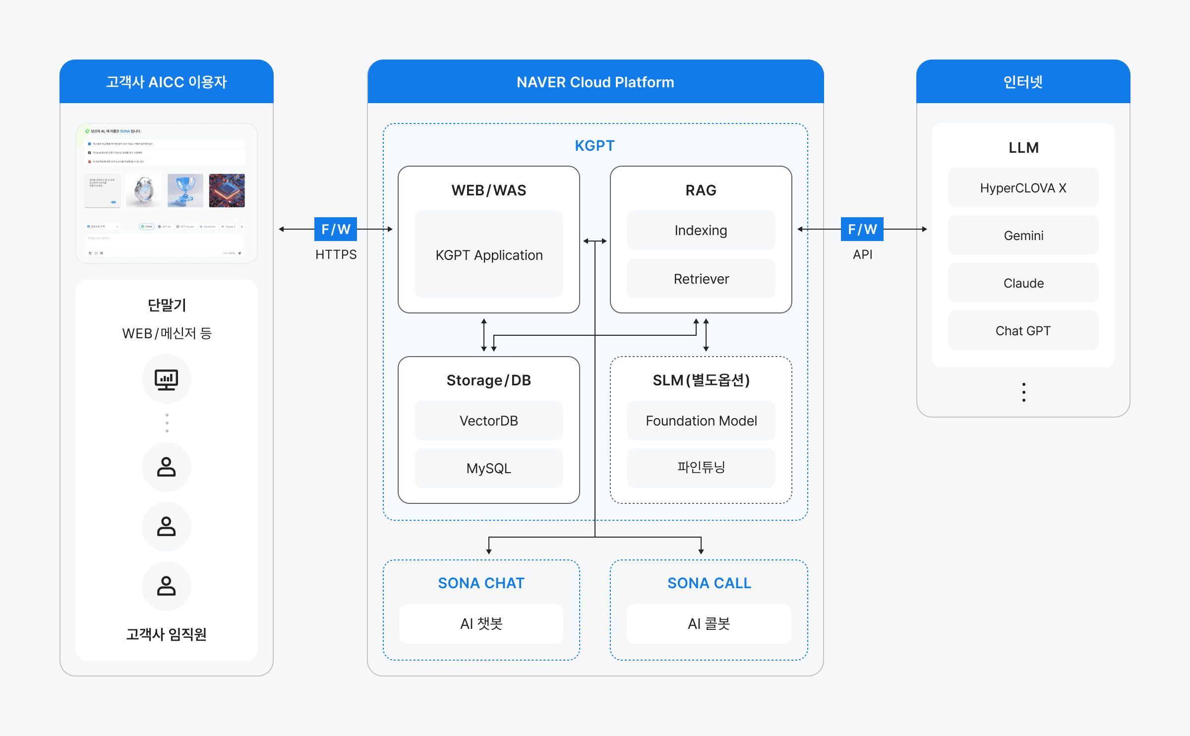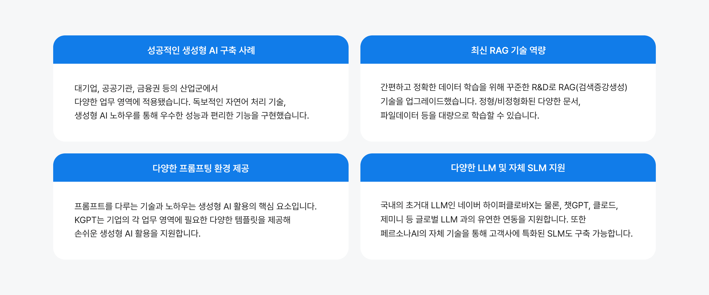 페르소나AI‘KGPT’ 생성형 AI 활용을 통해 업무생산성을 극대화하는 AI 어시스턴트 솔루션입니다. RAG(검색증강생성) 기술을 적용해 기존 GPT 서비스의 보안∙오답∙편향성 문제를 해결했습니다. 우수한 성능과 정확성으로 대기업, 공공기관, 금융권에 도입되었으며, 전사에서 사용하는 사내 AI 플랫폼으로도 활용되고 있습니다. 페르소나AIAI 챗봇과 콜봇, SLM 솔루션과의 연계 구축도 가능합니다.