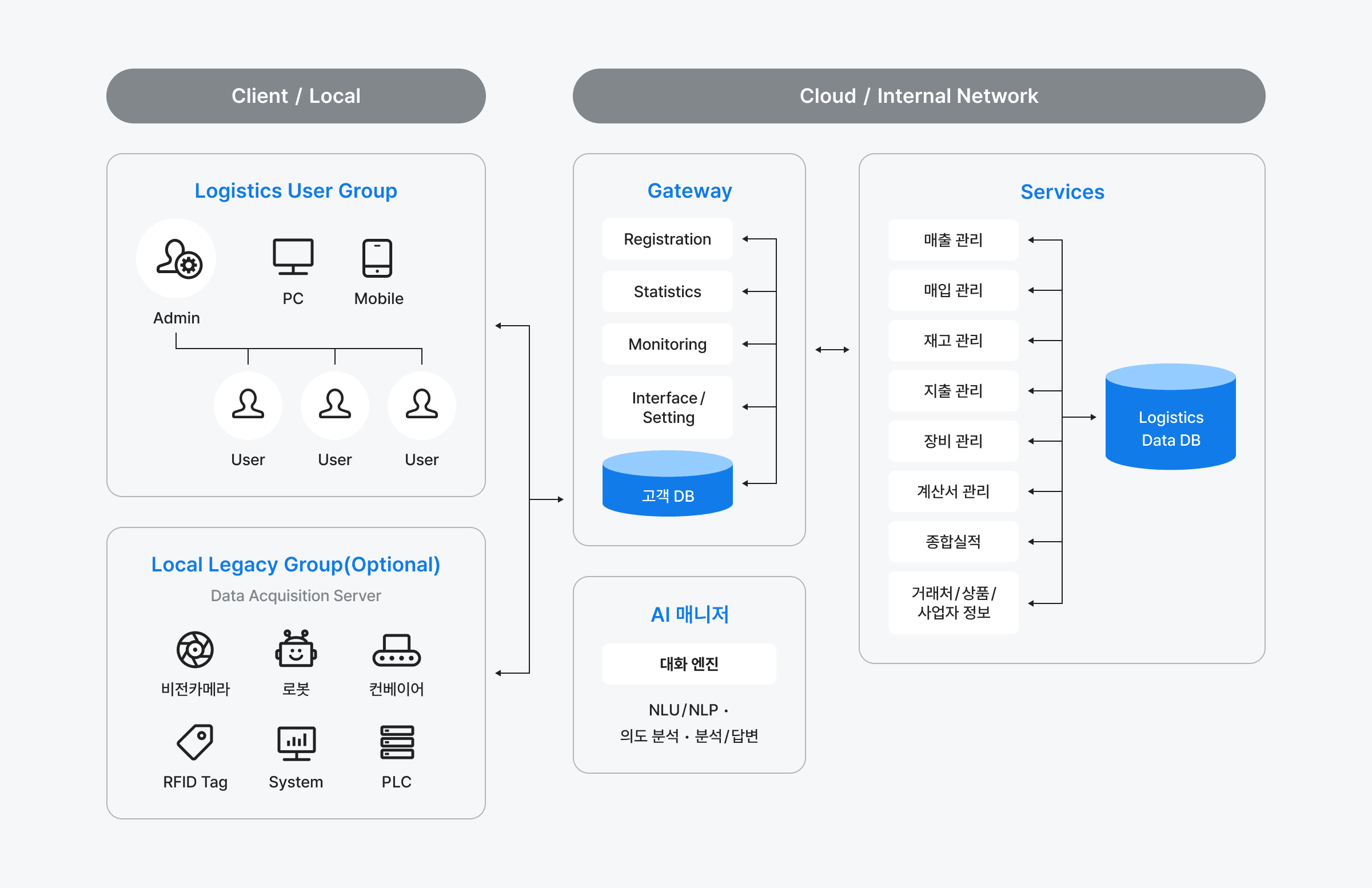 스마트 물류 서비스는 상위 물류 회사가 하위 물류 회사와 연계하여 물류 흐름을 실시간으로 파악할 수 있도록 설계된 SaaS(Software as a Service) 기반의 통합 물류 관리 솔루션입니다.  이 시스템은 복잡한 공급망 구조에서도 물류 정보를 실시간으로 수집하고 분석하여 모든 물류 프로세스를 효율적으로 관리할 수 있습니다.  또한, 상위 물류 회사는 하위 회사의 재고, 배송 상태, 매출, 매입 등 다양한 데이터를 한눈에 확인하고 AI를 접목하여 신속한 의사결정을 내릴 수 있으며, 하위 물류 회사는 상위 물류 회사와의 연계를 통해 원활한 물류 흐름을 유지할 수 있습니다.