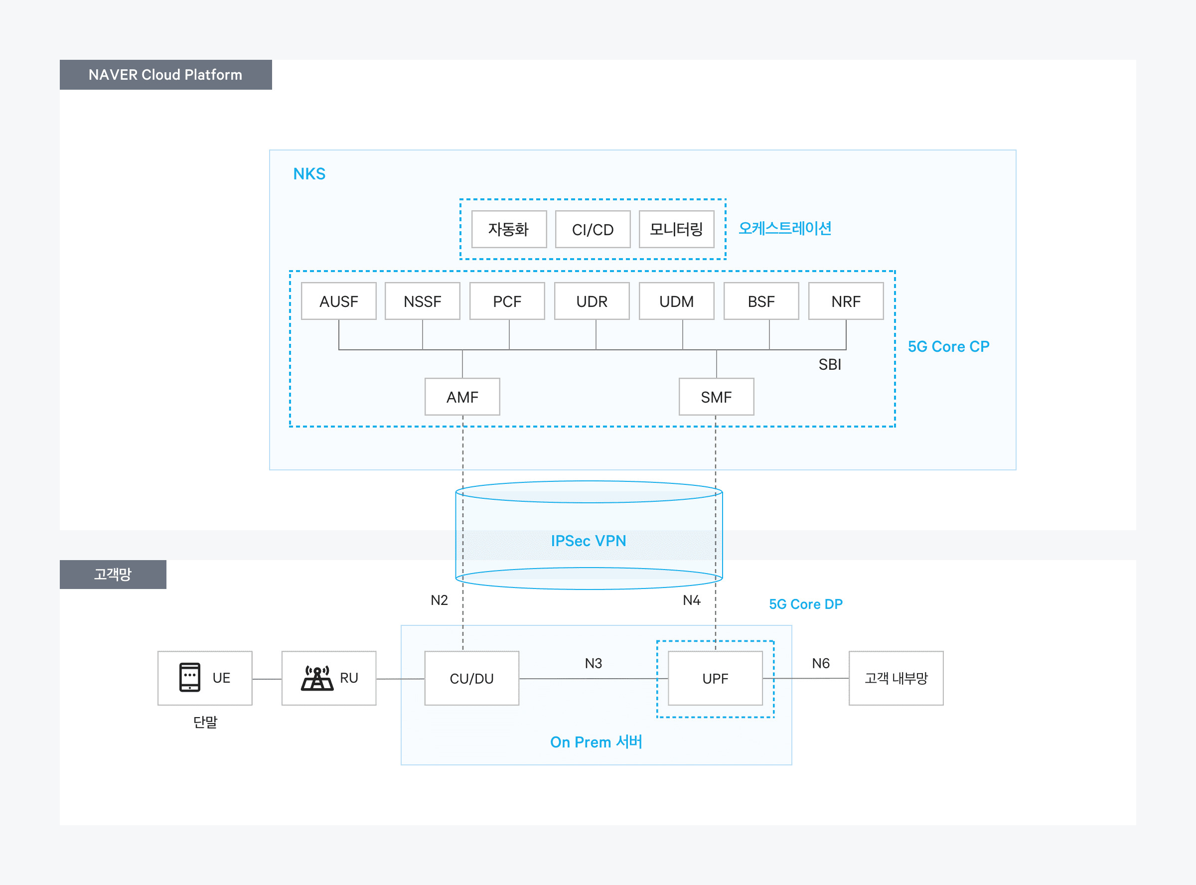 현재 서비스 구성은, 5G Core 중 컨트롤 영역(CP)은 Naver Cloud Platform(NCP)에 구성되고, 데이터 영역(DP)은 On-Prem.으로 구성