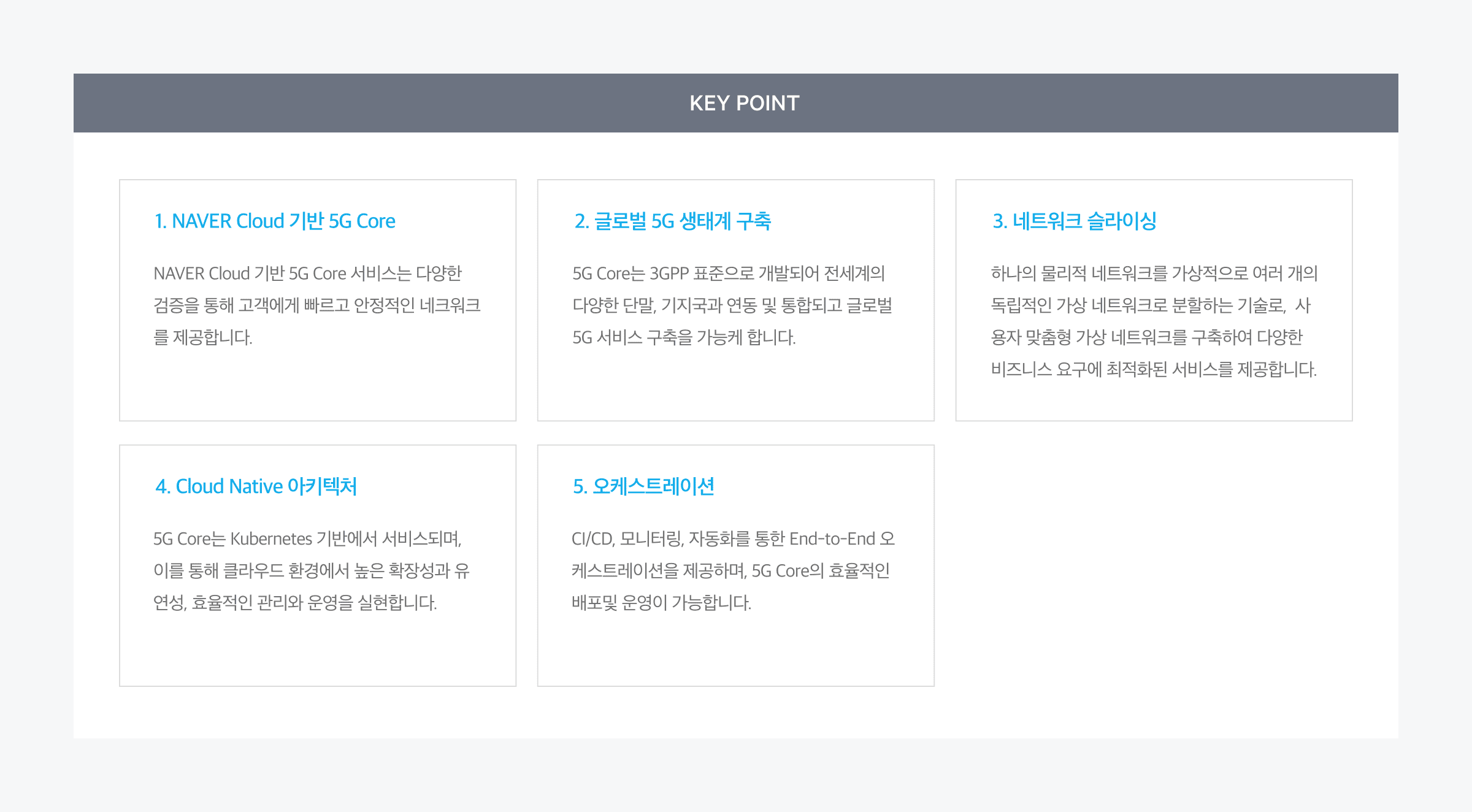 LG CNS 5G Core 솔루션은 독립형(SA) 5G 코어 및 RAN 네트워크로 전환하려는 기업에 이상적인 솔루션으로 enhanced mobile broadband(eMBB), massive machine-type communication(mMTC)에서 ultra-reliable low latency communication(URLLC)까지 완전히 새로운 5G 서비스를 가능하게 합니다. 또한, 다양한 시나리오에 따라 단일 사이트에서 다중 사이트 5G 서비스 구축을 지원하며, 네트워크 기능 아키텍처에 CUPS(Control and User Plane Separation)로 설계되어 Edge 사이트에서 사용자 데이터를 계산할 수 있으므로 데이터 전송 대기 시간이 줄어들고 로컬 사이트의 운영 및 관리 효율성이 높아집니다.
