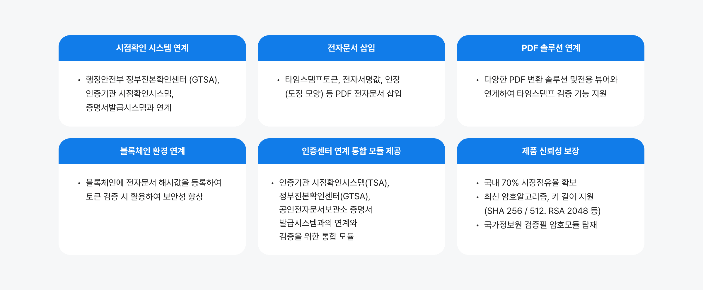 - 타임스탬프 토큰 발급, 장기검증, PKI 툴킷, 암호모듈 등 TSA 관련 전체 솔루션을 통해 서비스 확장성을 보장합니다.