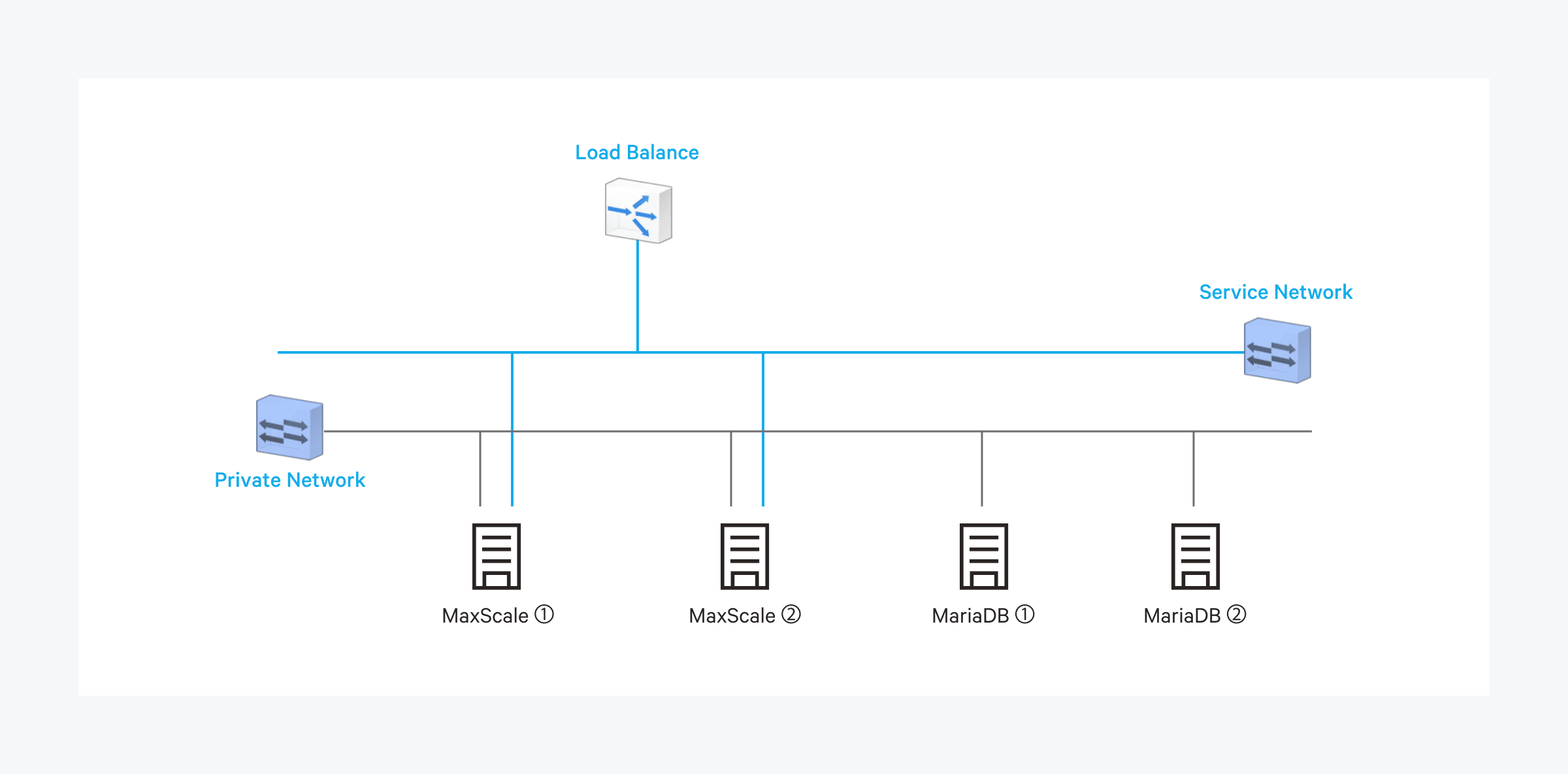 MariaDB 이중화 구성은 아래의 구성과 같이 DB서버 2식과 Maxscale 2식으로 구성되며 Load Balance를 구성하여 세션을 분배하여 구성합니다.